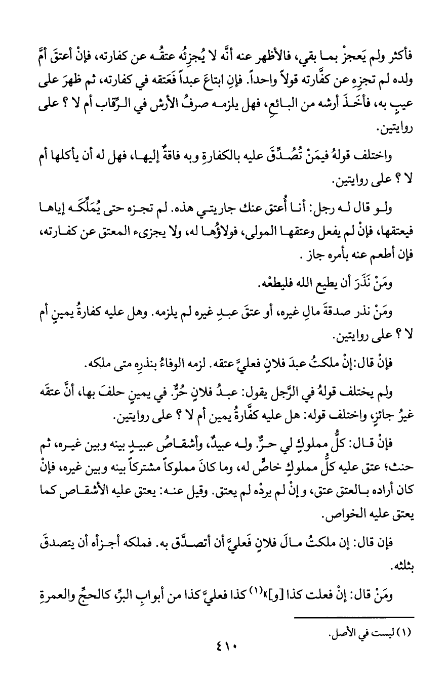 فأكثر ولم يعجز بما بقي, فالأظهر عنه أنه لا يجزئه عتقه عن كفارته, فإن أعتق أم ولده لم تجزه عن كفارته قولا واحدا. فإن ابتاع عبدا فعتقه في كفارته, ثم ظهر على عيب به, فأخذ أرشه من البائع, فهل يلزمه صرف الأرش في الرقاب أم لا؟ على روايتين.