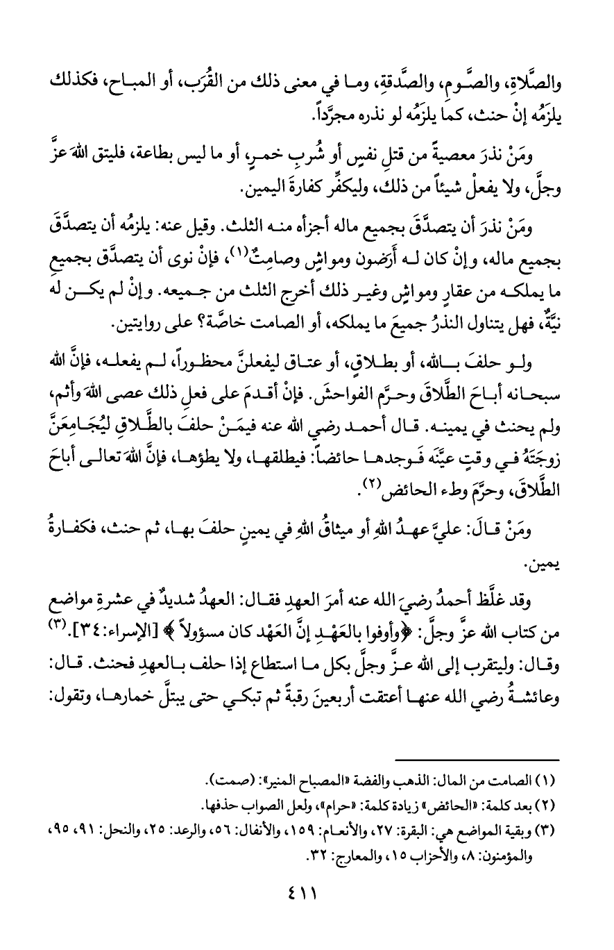وقد غلظ أحمد رضي الله عنه أمر العهد فقال: العهد شديد في عشرة مواضع من كتاب الله عز وجل: {وأوفوا بالعهد إن العهد كان مسؤولا} [الإسراء: 34]. وقال: وليتقرب إلى الله عز وجل بكل ما استطاع إذا حلف بالعهد فحنث. قال: وعائشة رضي الله عنها أعتقت أربعين رقبة ثم تبكي حتى يبتل خمارها, وتقول:
