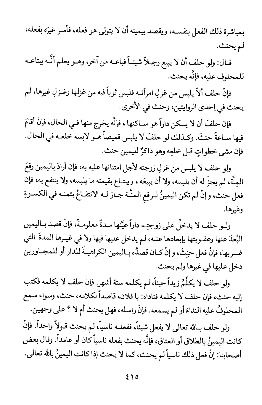 فإن حلف أن لا يسكن دارا هو ساكنها, فإنه يخرج منها في الحال, فإن أقام فيها ساعة حنث. وكذلك لو حلف لا يلبس قميصا هو لابسه خلعه في الحال. فإن مشى خطوات قبل خلعه وهو ذاكر لليمين حنث.