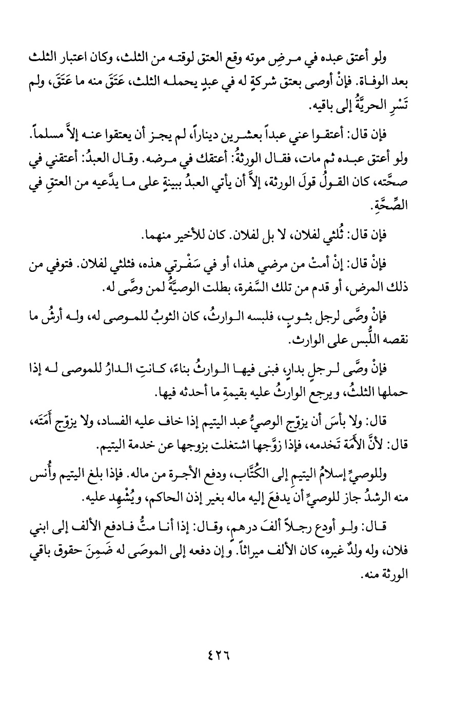 ولو أعتق عبده في مرض موته وقع العتق لوقته من الثلث, وكان اعتبار الثلث بعد الوفاة. فإن أوصى بعتق شركة له في عبد يحمله الثلث, عتق منه ما عتق, ولم تسر الحرية إلى باقيه.