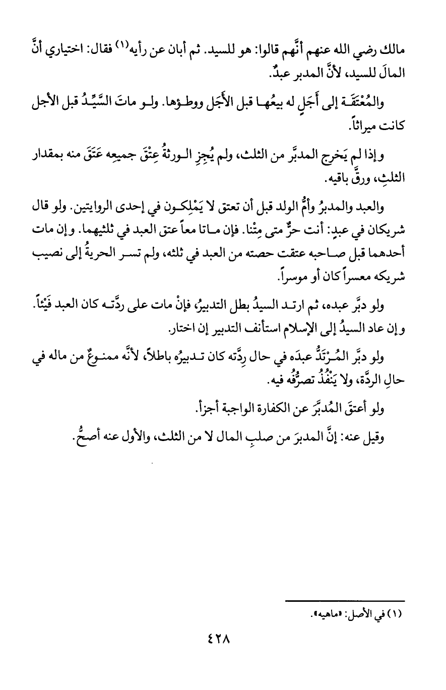 مالك رضي الله عنه أنهم قالوا: هو للسيد. ثم أبان عن رأيه فقال: اختياري أن المال للسيد, لأن المدبر عبد.