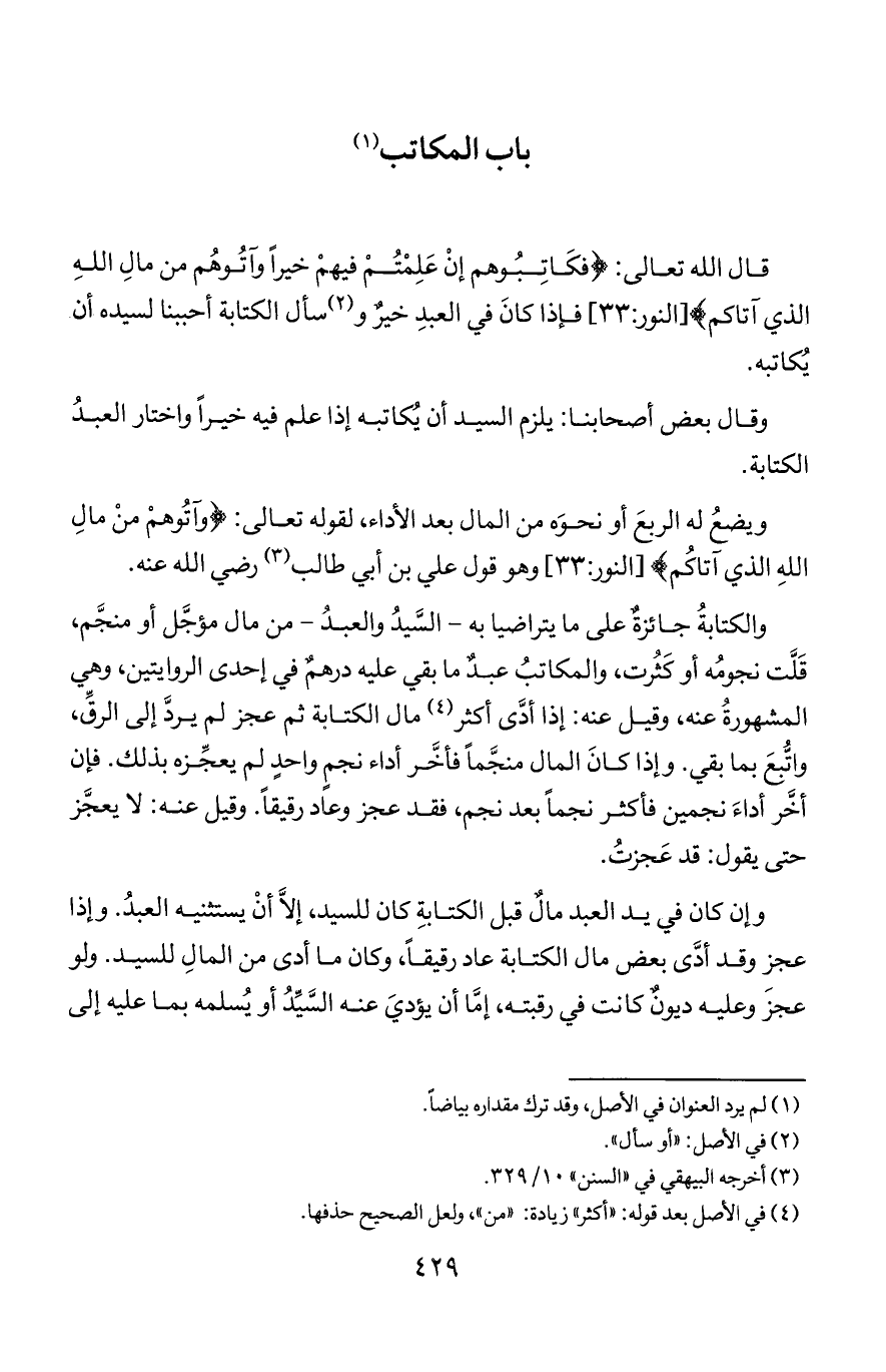 والكتابة جائزة على ما يتراضيا به -السيد والعبد- من مال مؤجل أو منجم, قلت نجومه أو كثرت, والمكاتب عبد ما بقي عليه دراهم في إحدى الروايتين, وهي المشهورة عنه, وقيل عنه: إذا أدى أكثر مال الكتابة ثم عجز لم يرد إلى الرق, واتبع بما بقي. وإذا كان المال منجما فأخر أداء نجم واحد لم يعجِّزه بذلك. فإن أخر أداء نجمين فأكثر نجما بعد نجم, فقد عجز وعاد رقيقا. وقيل عنه: لا يعجز حتى يقول: قد عجزت.