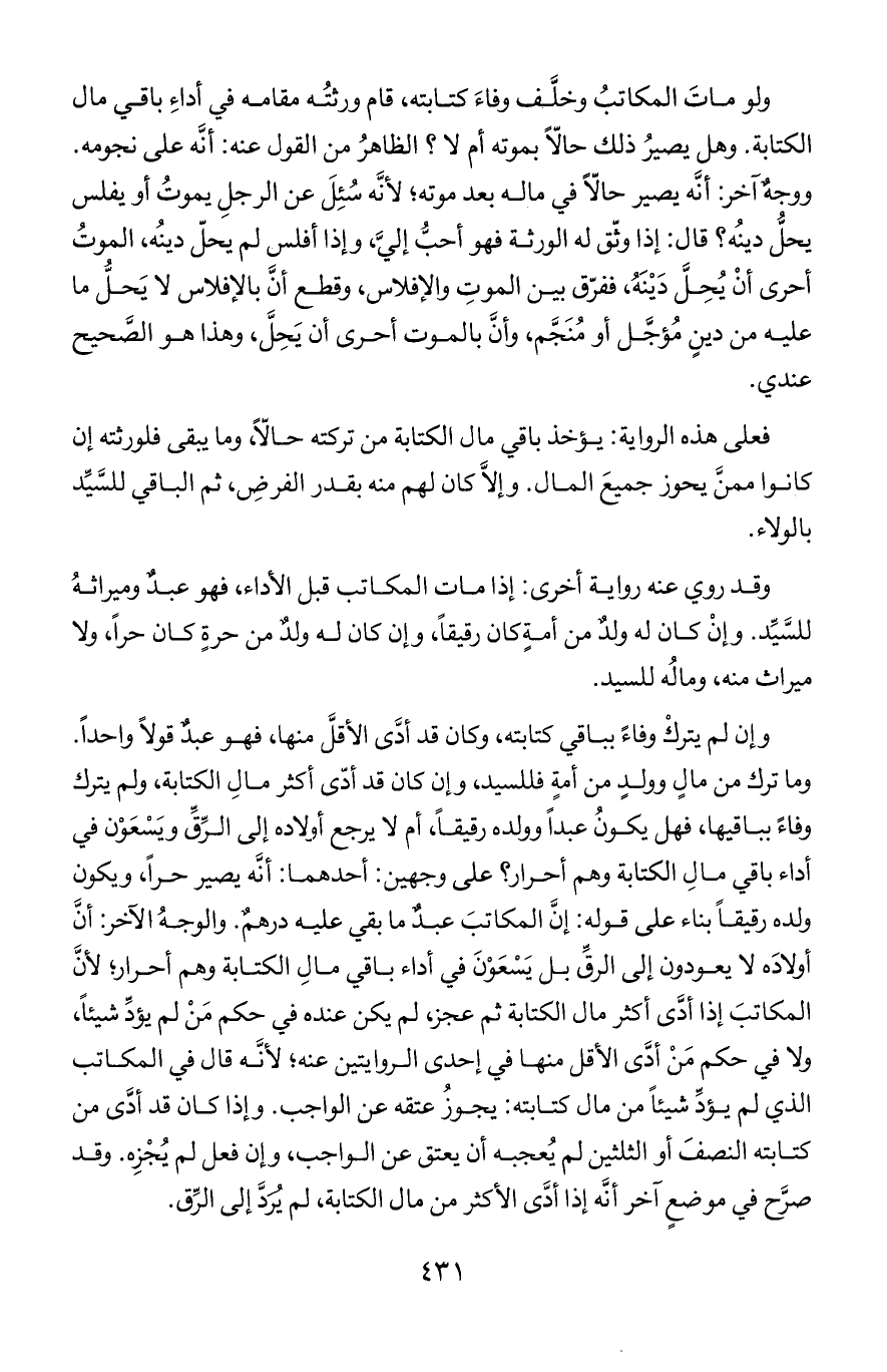 وإن لم يترك وفاء بباقي كتابته, وكان قد أدى الأقل منها, فهو عبد قولا واحدا. وما ترك من مال وولد من أمة فللسيد, وإن كان قد أدى أكثر مال الكتابة, ولم يترك وفاء بباقيها, فهل يكون عبدا وولده رقيقا, أم لا يرجع أولاده إلى الرق ويسعون في أداء باقي مال الكتابة وهم أحرار؟ على وجهين: أحدهما: أنه يصير حرا, ويكون ولده رقيقا بناء على قوله: إن المكاتب عبد ما بقي عليه درهم. والوجه الآخر: أن أولاده لا يعودون إلى الرق بل يسعون في أداء باقي مال المكاتبة وهم أحرار؛ لأن المكاتب إذا أدى أكثر مال الكتابة ثم عجز, لم يكن عنده في حكم من لم يؤد شيئا, ولا في حكم من أدى الأقل منها في إحدى الروايتين عنه؛ لأنه قال في المكاتب الذي لم يؤد شيئا من مال كتابته: يجوز عتقه عن الواجب. وإذا كان قد أدى من كتابته النصف أو الثلثين لم يعجبه أن يعتق عن الواجب, وإن فعل لم يجزه. وقد صرح في موضع آخر أنه إذا أدى الأكثر من مال الكتابة, لم يرد إلى الرق.