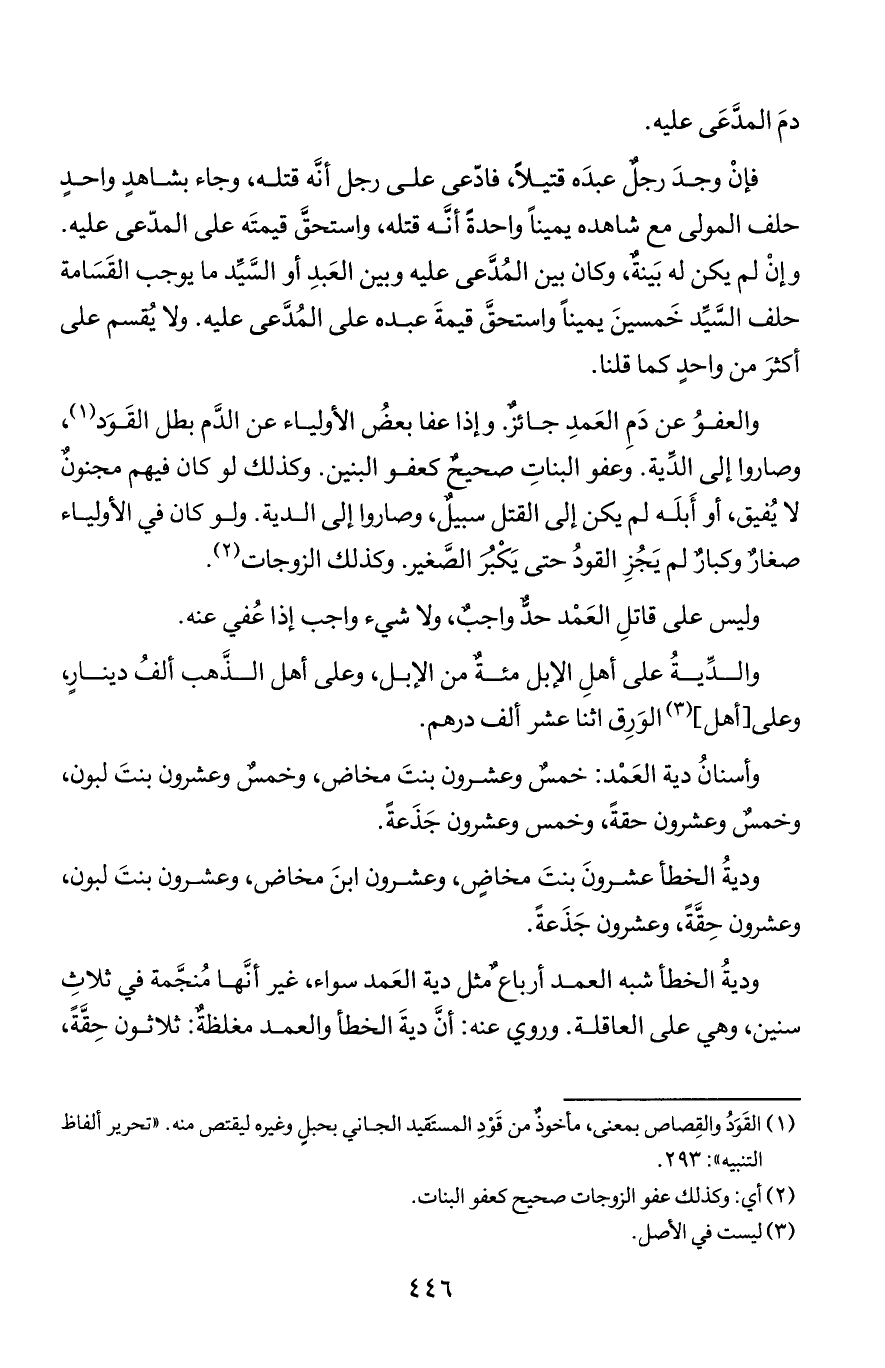 ودية الخطأ شبه العمد أرباع مثل دية العمد سواء, غير أنها منجمة في ثلاث سنين, وهي على العاقلة. وروي عنه: أن دية الخطأ والعمد مغلظة: ثلاثون حقة,