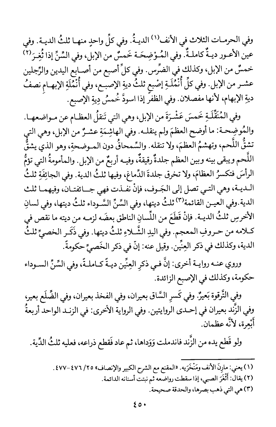 وفي المنقلة خمس عشرة من الإبل, وهي التي تنقل العظام من مواضعها. والموضحة: ما أوضح العظم ولم ينقله. وفي الهاشمة عشر من الإبل, وهي التي تشق اللحم, وتهشم العظم, ولا تنقله. والسمحاق دون الموضحة, وهو الذي يشق اللحم ويبقى بينه وبين العظم جلدة رقيقة, وفيه أربع من الإبل. والمأمومة التي تؤم الرأس فتكسر العظام, ولا تخرق جلدة الدماغ, وفيها ثلث الدية. وفي الجائفة ثلث الدية, وهي التي تصل إلى الجوف, فإن نفذت فهي جائفتان, وفيهما ثلث الدية. وفي العين القائمة ثلث ديتها, وفي السن السوداء ثلث ديتها, وفي لسان الأخرس ثلث الدية. فإن قطع من اللسان الناطق بعضه لزمه من ديته ما نقص في كلامه من حروف المعجم. وفي اليد الشلاء ثلث ديتها. وفي ذكر الخصي ثلث الدية, وكذلك في ذكر العنين. وقيل عنه: إن في ذكر الخصي حكومة.