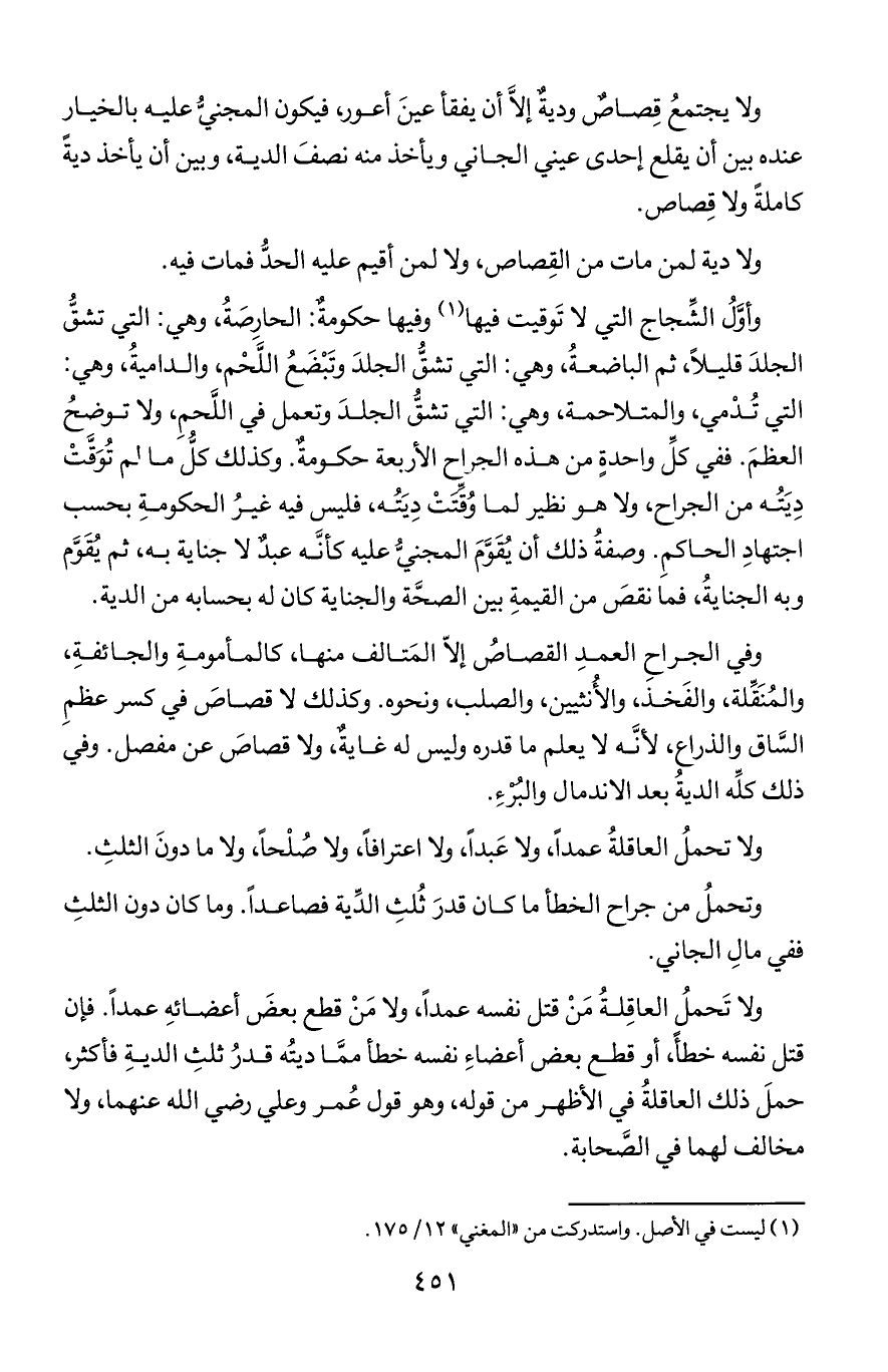 وفي الجراح العمد القصاص إلا المتالف منها, كالمأمومة والجائفة, والمنقلة, والفخذ, والأنثيين, والصلب, ونحوه. وكذلك لا قصاص في كسر عظم الساق والذراع, لأنه لا يعلم ما قدره وليس له غاية, ولا قصاص عن مفصل. وفي ذلك كله الدية بعد الاندمال والبرء.