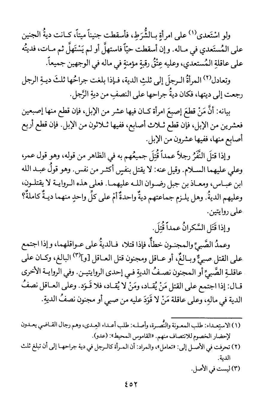 وعمد الصبي والمجنون خطأ, فإذا قتلا, فالدية على عواقلهما, وإذا اجتمع على القتل صبي وبالغ, أو عاقل ومجنون قتل العاقل والبالق, وكان على عاقلة الصبي أو المجنون نصف الدية في إحدى الروايتين. وفي الرواية الأخرى قال: إذا اجتمع على القتل من يقاد, ومن لا يقاد, فلا قود. وعلى العاقل نصف الدية في ماله, وعلى عاقلة من لا قود عليه من صبي أو مجنون نصف الدية.