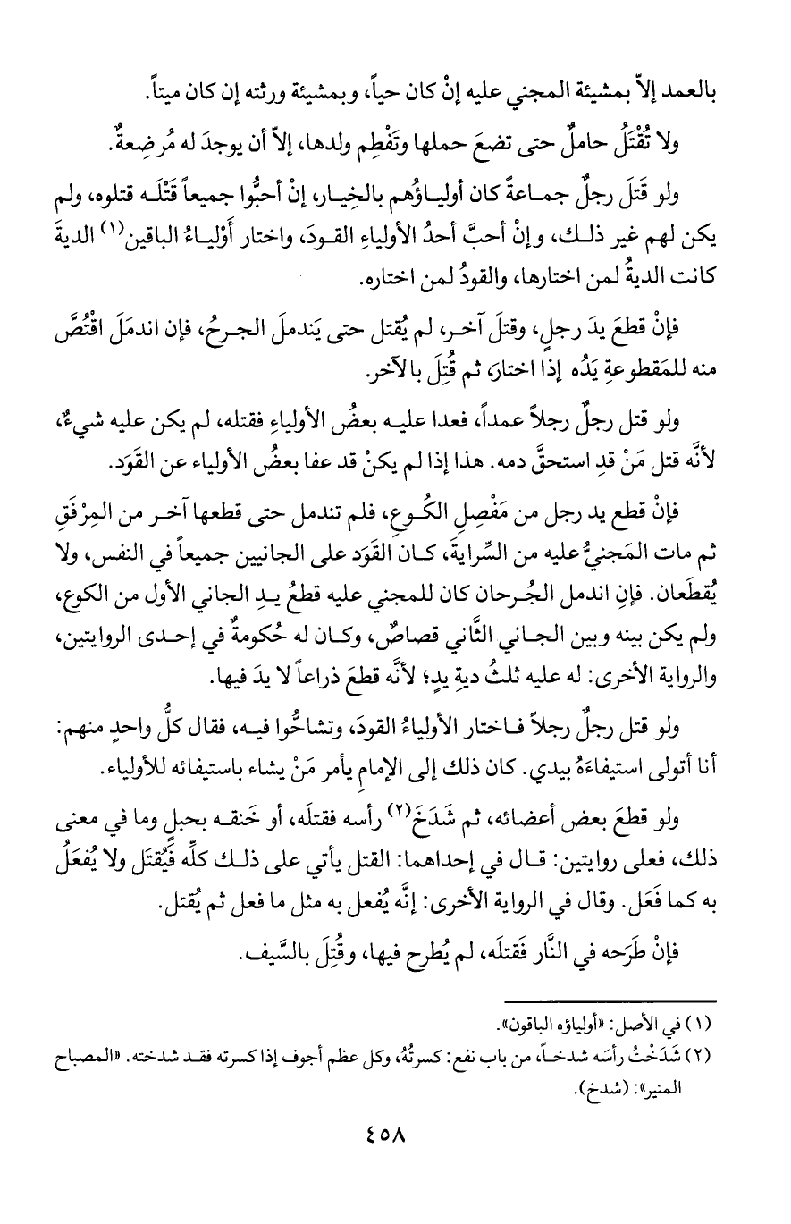 فإن قطع يد رجل من مفصل الكوع, فلم تندمل حتى قطعها آخر من المرفق ثم مات المجني عليه من السراية, كان القود على الجانيين جميعا في النفس, ولا يقطعان. فإن اندمل الجرحان كان للمجني عليه قطع يد الجاني الأول من الكوع, ولم يكن بينه وبين الجاني الثاني قصاص, وكان له حكومة في إحدى الروايتين, والرواية الأخرى: له عليه ثلث دية يد؛ لأنه قطع ذراعا لا يد فيها.