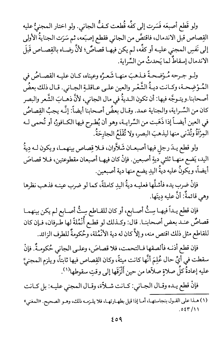 ولو قطع يد رجل فيها إصبعان شلَّاوان, فلا قصاص بينهما, ويكون له دية اليد, يضع منها ثلثي دية إصبعين. فإن كان فيها أصبعان مقطوعتين, فلا قصاص أيضا, ويكون عليه دية اليد يضع منها دية أصبعين.