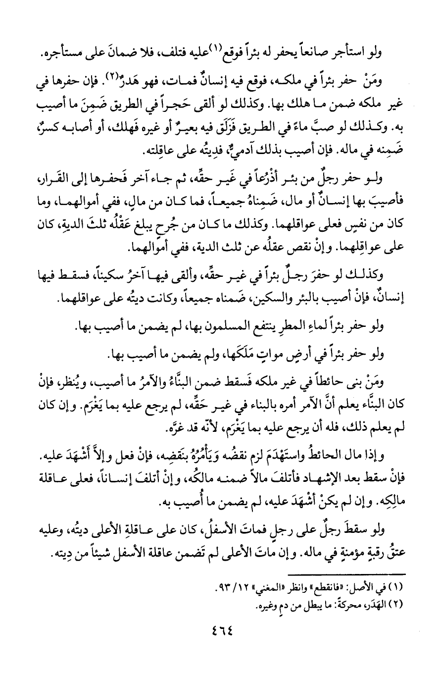 ومن حفر بئرا في ملكه, فوقع فيه إنسان فمات, فهو هدر. فإن حفرها في غير ملكه ضمن ما هلك بها. وكذلك لو ألقى حجرا في الطريق ضمن ما أصيب به. وكذلك لو صب ماء في الطريق فزلق فيه بعير أو غيره فهلك, أو أصابه كسر, ضمنه في ماله. فإن أصيب بذلك آدمي, فديته على عاقلته.