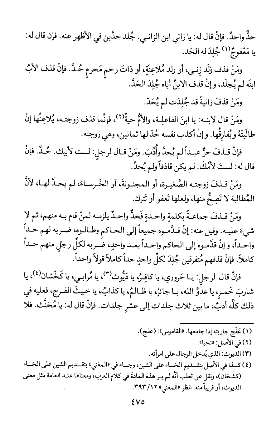 فإن قال لرجل: يا حروري, يا كافر, يا ديوث, يا مرابي, يا كشخان, يا شارب خمر, يا عدو الله, يا جائر, يا ظالم, يا كذاب, يا خبيث الفرج, فعليه في ذلك كله أدب, ما بين ثلاث جلدات إلى عشر جلدات. فإن قال له: يا مخنث. فلا