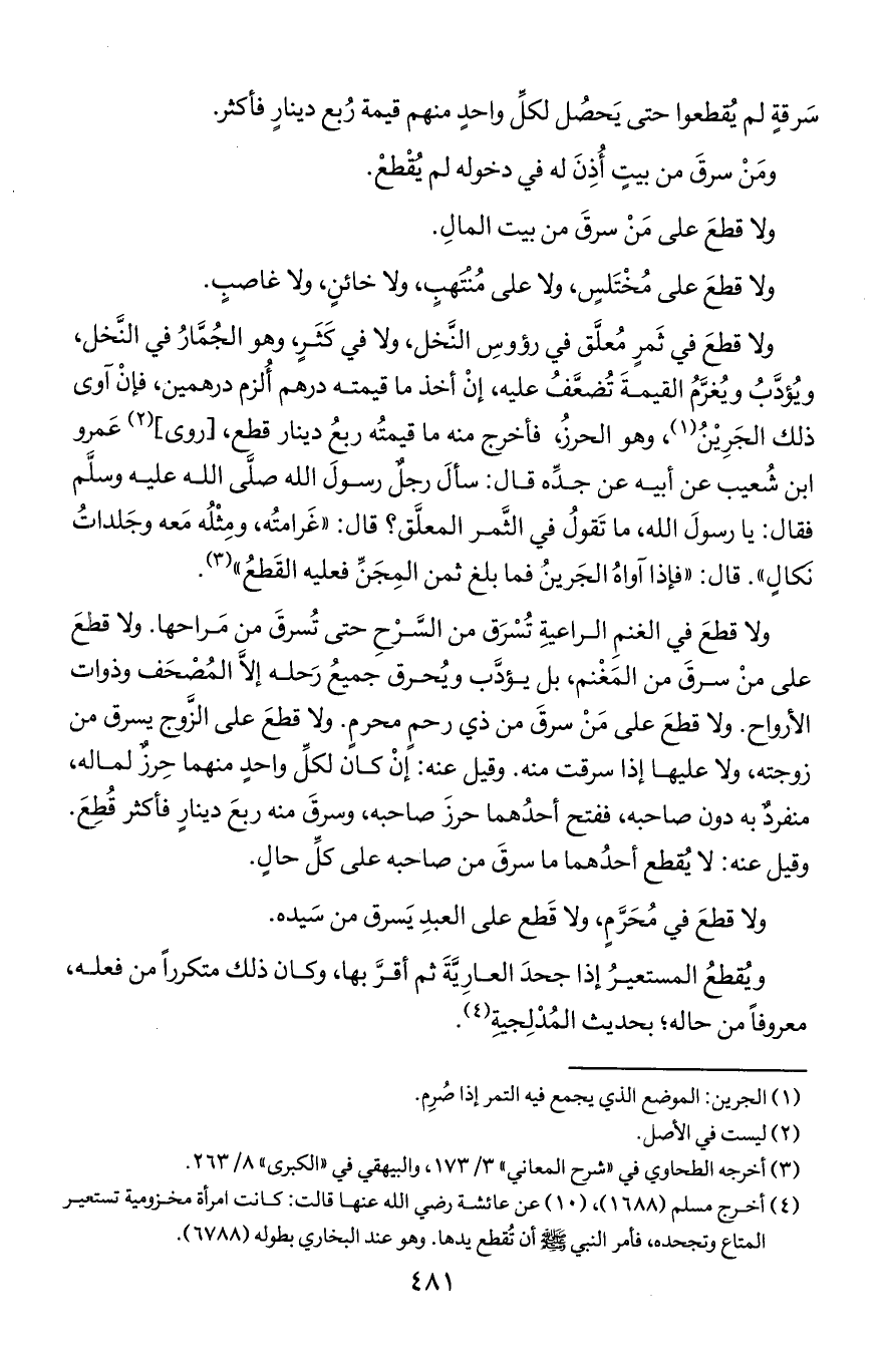 ولا قطع في الغنم الراعية تسرق من السرح حتى تسرق من مراحها. ولا قطع على من سرق من المغنم, بل يؤدب ويحرق جميع رحله إلا المصحف وذوات الأرواح. ولا قطع على من سرق من ذي رحم محرم. ولا قطع على الزوج يسرق من زوجته, ولا عليها إذا سرقت منه. وقيل عنه: إن كان لكل واحد منهما حرز لماله, منفرد به دون صاحبه, ففتح أحدهما حرز صاحبه, وسرق منه ربع دينار فأكثر قطع. وقيل عنه: لا يقطع أحدهما ما سرق من صاحبه على كل حال.