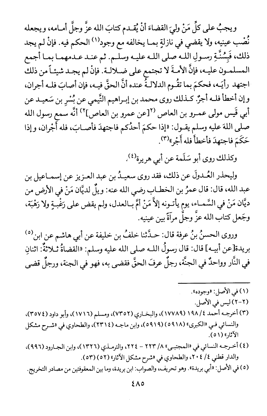 ويجب على كل من ولي القضاء أن يقدم كتاب الله عز وجل أمامه, ويجعله نصب عينيه, ولا يقضي في نازلة بما يخالفه مع وجود الحكم فيه. فإن لم يجد ذلك, فبسنة رسول الله صلى الله عليه وسلم. ثم عند عدمهما بما أجمع المسلمون عليه, فإن الأمة لا تجتمع على ضلالة. فإن لم يجد شيئا من ذلك اجتهد رأيه, فحكم بما تقوم الدلالة عنده أن الحق فيه, فإن أصاب فله أجران, وإن أخطأ فله أجر. كذلك روى محمد بن إبراهيم التيمي عن بسر بن سعيد عن أبي قيس مولى عمرو بن العاص عن عمرو بن العاص أنه سمع سول الله صلى الله عليه وسلم يقول: "إذا حكم أحدكم فاجتهد فأصاب, فله أجران, وإذا حكم فاجتهد فأخطأ فله أجر".