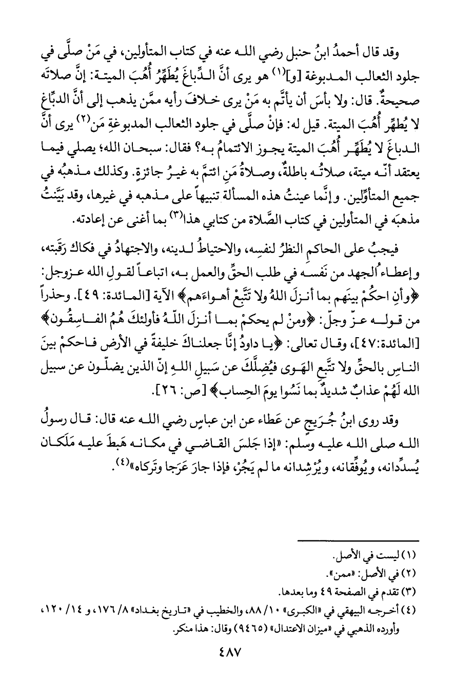وقد قال أحمد ابن حنبل رضي الله عنه في كتاب المتأولين, في من صلى في جلود الثعالب المدبوغة وهو يرى أن الدباغ يطهر أهب الميتة: إن صلاته صحيحة. قال: ولا بأس أن يأتم به من يرى خلاف رأيه ممن يذهب إلى أن الدباغ لا يطهر أهب الميتة. قيل له فإن صلى في جلود الثعالب المدبوغة من يرى أن الدباغ لا يطهر أهب الميتة يجوز الائتمام به؟ فقال: سبحان الله؛ يصلي فيما يعتقد أنه ميتة, صلاته باطلة, وصلاة من ائتم به غير جائزة. وكذلك مذهبه في جميع المتأولين. وإنما عينت هذه المسألة تنبيها على مذهبه في غيرها, وقد بينت مذهبه في المتأولين في كتاب الصلاة من كتابي هذا بما أغنى عن إعادته.