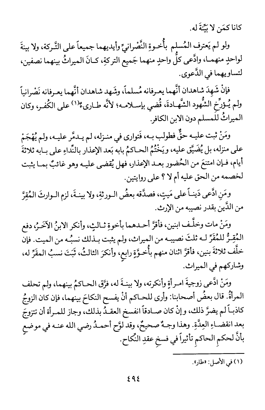فإن شهد شاهدان أنهما يعرفانه مسلما, وشهد شاهدان أنهما يعرفانه نصرانيا ولم يؤرخ الشهود الشهادة, قضي بإسلامه؛ لأنه طارئ على الكفر, وكان الميراث للمسلم دون الابن الكافر.
