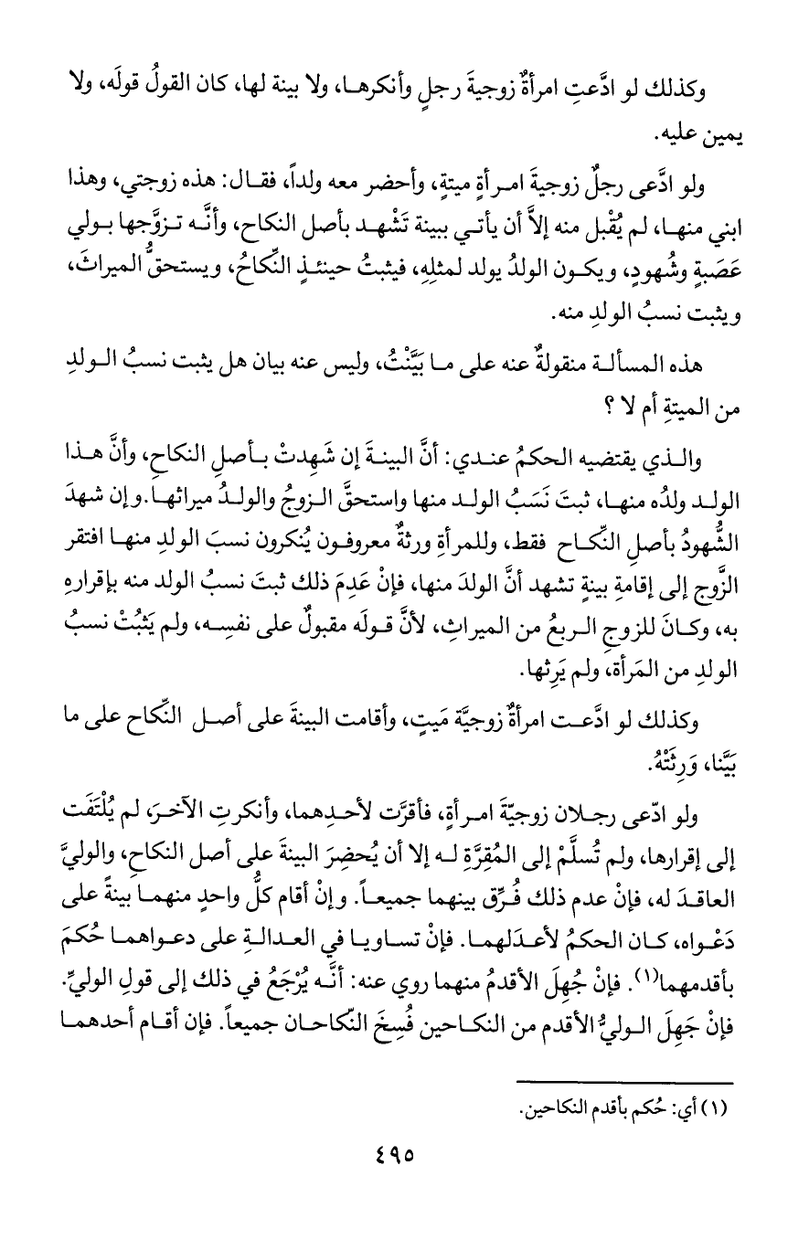والذي يقتضيه الحكم عندي: أن البينة إن شهدت بأصل النكاح, وأن هذا الولد ولده منها, ثبت نسب الولد منها واستحق الزوج والولد ميراثها. وإن شهد الشهود بأصل النكاح فقط, وللمرأة ورثة معروفون ينكرون نسب الولد منها افتقر الزوج إلى إقامة بينة تشهد أن الولد منها, فإن عدم ذلك ثبت نسب الولد منه بإقراره به, وكان للزوج الربع من الميراث, لأن قوله مقبول على نفسه, ولم يثبت نسب الولد من المرأة ولم يرثها.