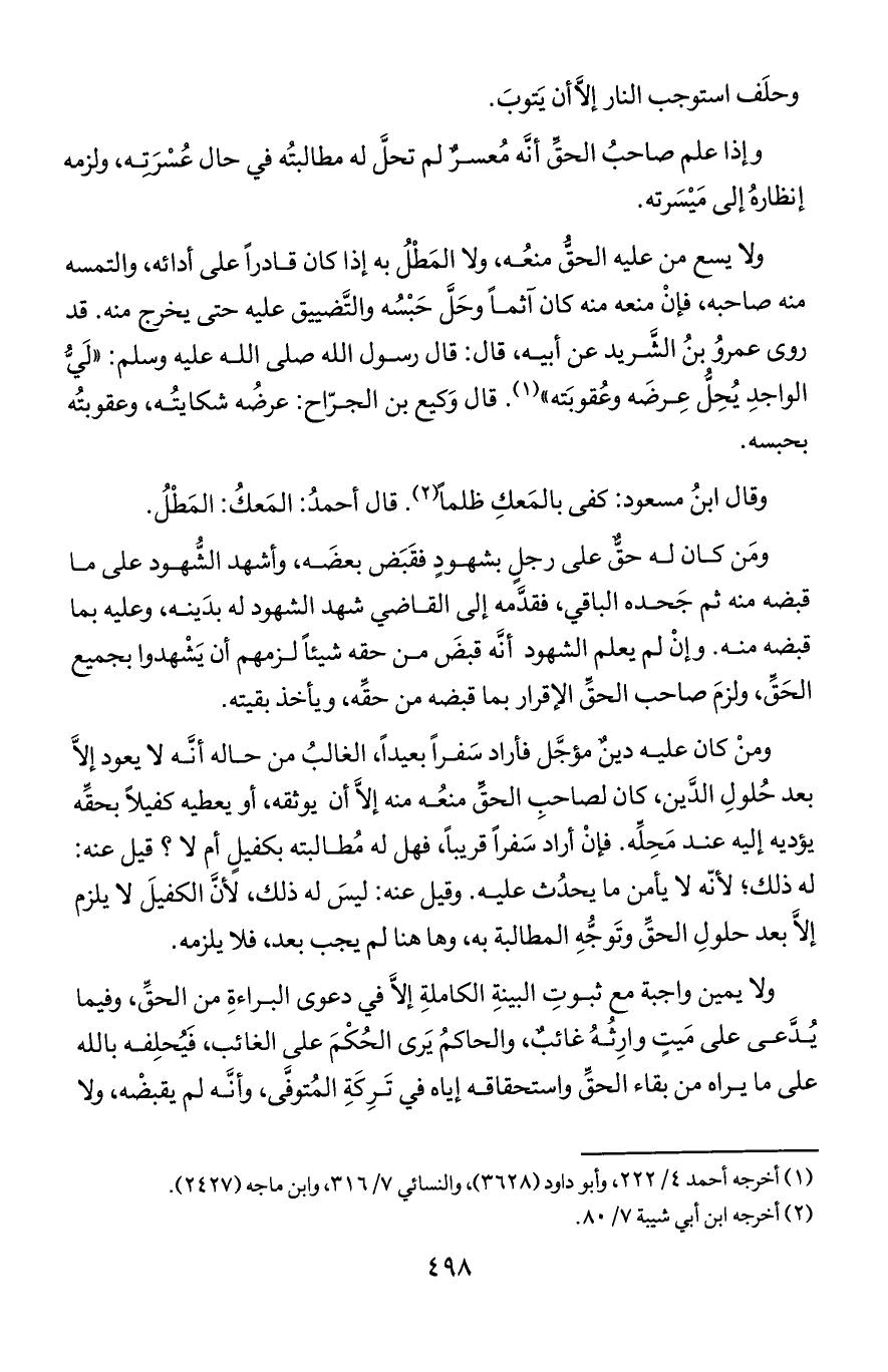 ولا يسع من عليه الحق منعه, ولا المطل به إذا كان قادرا على أدائه, والتمسه منه صاحبه, فإن منعه منه كان آثما وحل حبسه والتضييق عليه حتى يخرج منه. قد روى عمرو بن الشريد عن أبيه, قال: قال رسول الله صلى الله عليه وسلم: "ليّ الواجد يحل عرضه وعقوبته". قال وكيع بن الجراح: عرضه شكايته, وعقوبته بحبسه.