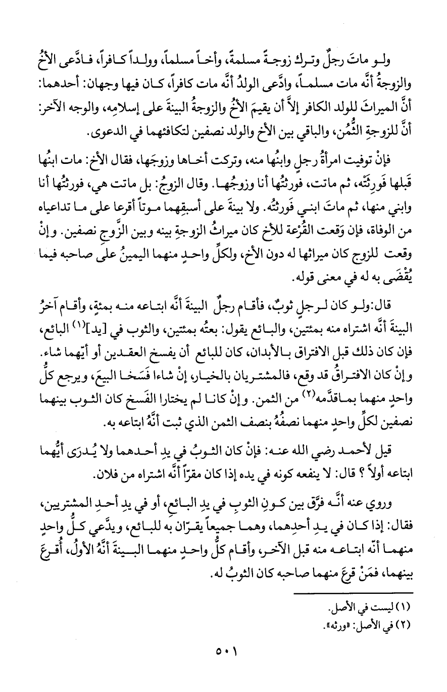فإن توفيت امرأة رجل وابنها منه, وتركت أخاها وزوجها, فقال الأخ: مات ابنها قبلها فورثته, ثم ماتت, فورثتها أنا وزوجها. وقال الزوج: بل ماتت هي, فورثتها أنا وابني منها, ثم مات ابني فورثته. ولا بينة على أسبقهما موتا أقرع على ما تداعياه من الوفاة, فإن وقعت القرعة للأخ كان ميراث الزوجة بينه وبين الزوج نصفين. وإن وقعت للزوج كان ميراثها له دون الأخ, ولكل واحد منهما اليمين على صاحبه فيما يقضى به له في معنى قوله.