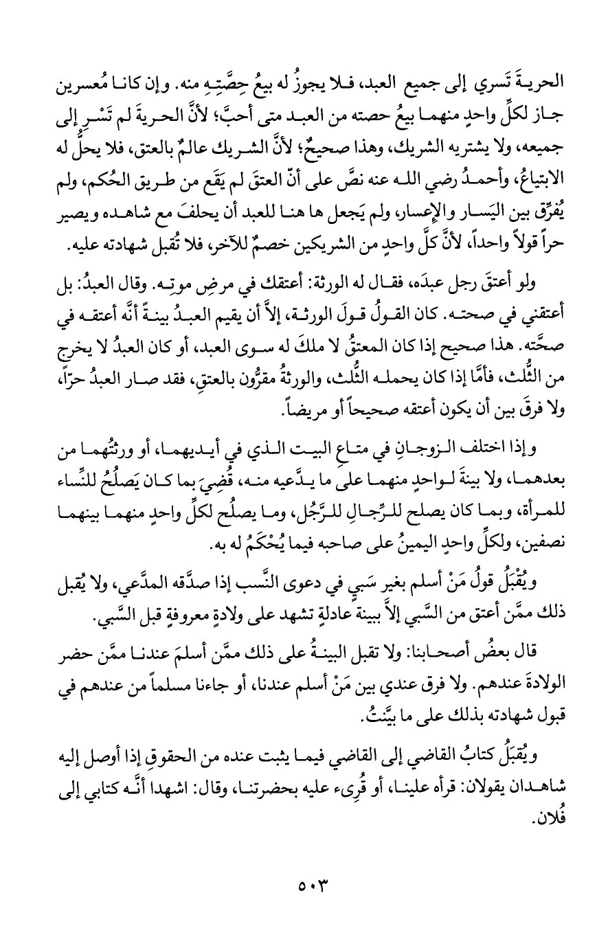 الحرية تسري إلى جميع العبد, فلا يجوز له بيع حصته منه. وإن كانا معسرين جاز لكل واحد منهما بيع حصته من العبد متى أحب؛ لأن الحرية لم تسر إلى جميعه, ولا يشتريه الشريك, وهذا صحيح؛ لأن الشريك عالم بالعتق, فلا يحل له الابتياع, وأحمد رضي الله عنه نص على أن العتق لم يقع من طريق الحكم, ولم يفرق بين اليسار والإعسار, ولم يجعل ها هنا للعبد أن يحلف مع شاهده ويصير حرا قولا واحدا, لأن كل واحد من الشريكين خصم للآخر, فلا تقبل شهادته عليه.