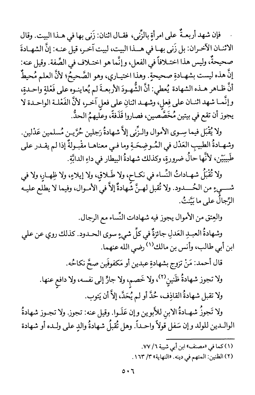 ولا تقبل شهادات النساء في نكاح, ولا طلاق, ولا إيلاء, ولا ظهار, ولا في شيء من الحدود. ولا تقبل لهن شهادة إلا في الأموال, وفيما لا يطلع عليه الرجال على ما بينت.