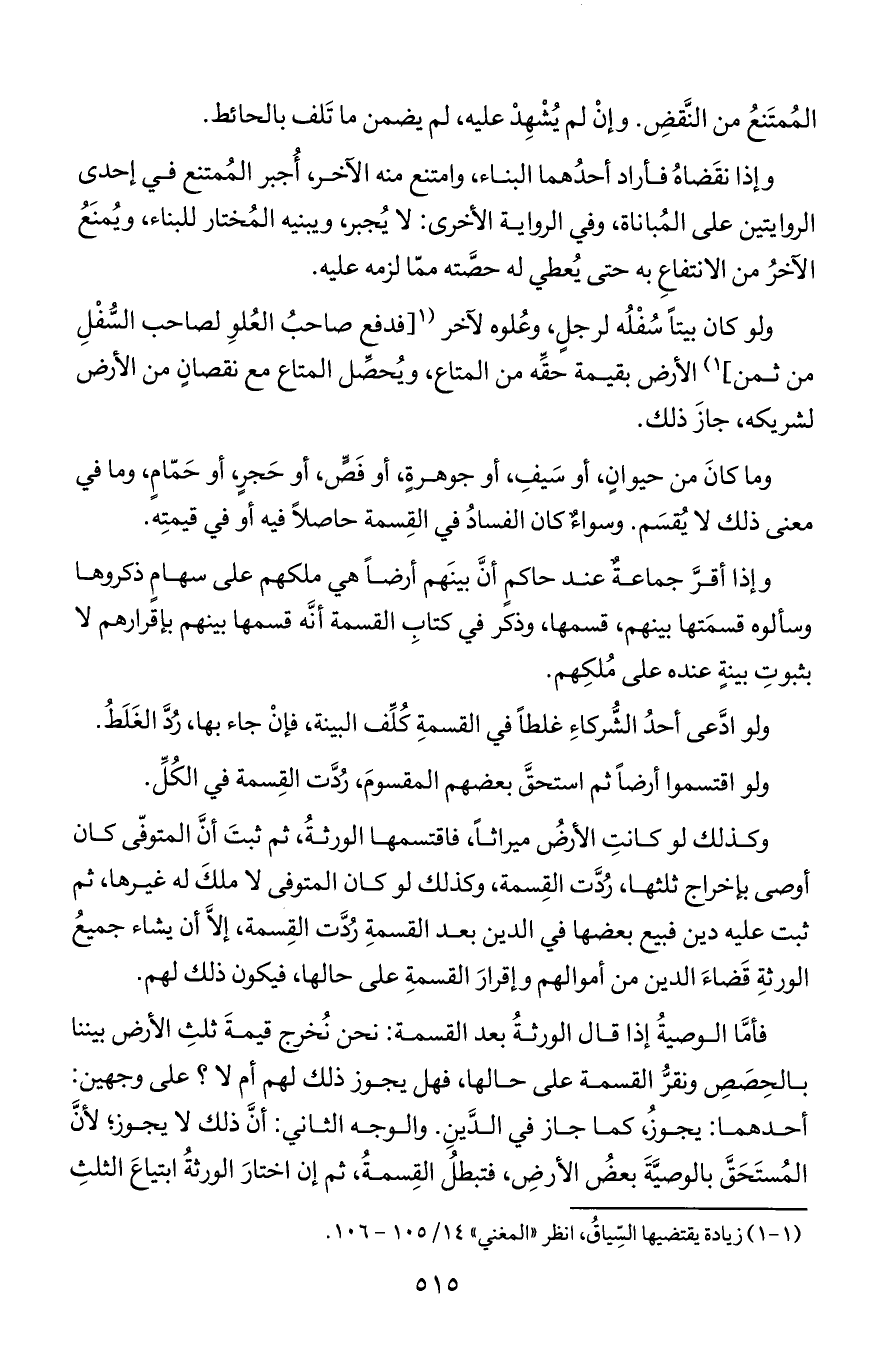 وكذلك لو كانت الأرض ميراثا, فاقتسمها الورثة, ثم ثبت أن المتوفى كان أوصى بإخراج ثلثها, ردت القيمة, وكذلك لو كان المتوفى لا ملك له غيرها, ثم ثبت عليه دين فبيع بعضها في الدين بعد القسمة ردت القسمة, إلا أن يشاء جميع الورثة قضاء الدين من أموالهم وإقرار القسمة على حالها, فيكون ذلك لهم.