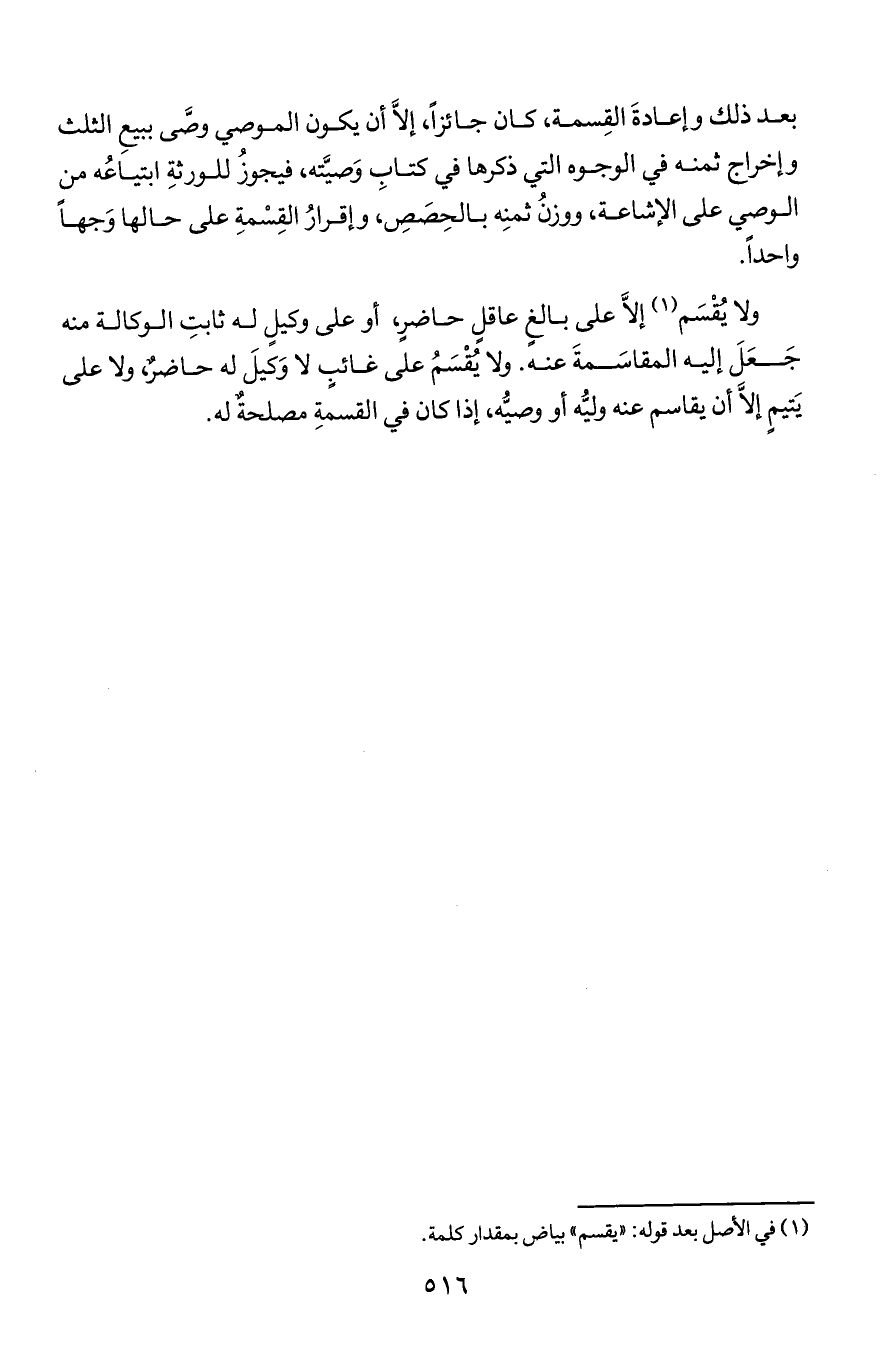 ولا يقسم إلا على بالغ عاقل حاضر, أو على وكيل له ثابت الوكالة منه جعل إلى المقاسمة عنه. ولا يقسم على غائب لا وكيل له حاضر, ولا على يتيم إلا أن يقاسم عنه وليه أو وصيه, إذا كان في القسمة مصلحة له.