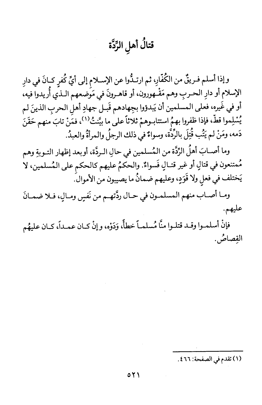 وما أصاب أهل الردة من المسلمين في حال الردة, أو بعد إظهار التوبة وهم ممتنعون في قتال أو غير قتال فسواء. والحكم عليهم كالحكم على المسلمين, لا يختلف في فعل ولا قود. وعليهم ضمان ما يصيبون من الأموال.