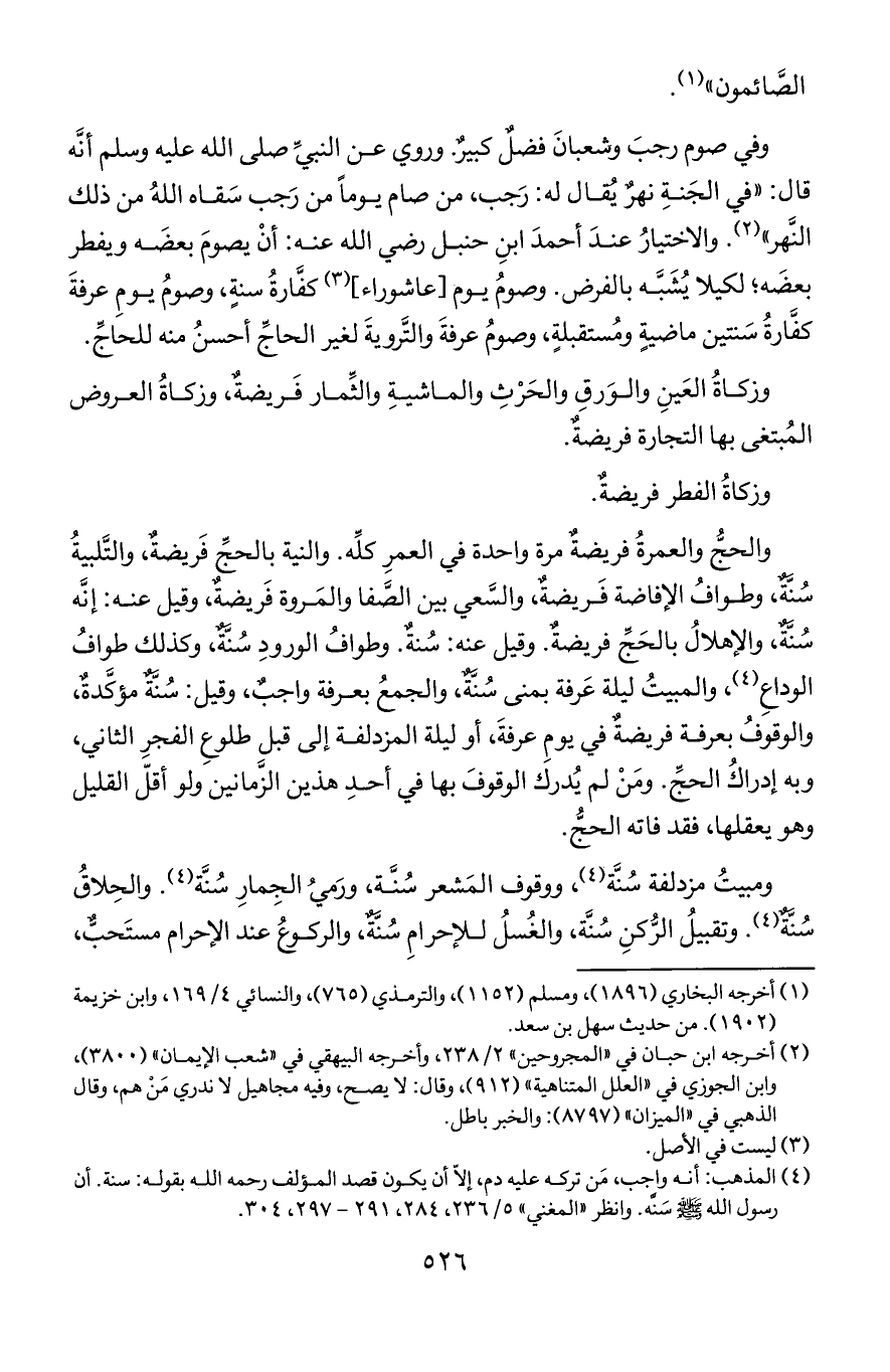 وفي صوم رجب وشعبان فضل كبير. وروي عن النبي صلى الله عليه وسلم أنه قال: "في الجنة نهر يقال له: رجب, من صام يوما من رجب سقاه الله من ذلك النهر". والاختيار عن أحمد ابن حنبل رضي الله عنه: أن يصوم بعضه ويفطر بعضه؛ لكيلا يشبَّه بالفرض. وصوم يوم عاشوراء كفارة سنة, وصوم يوم عرفة كفارة سنتين ماضية ومستقبلة, وصوم عرفة والتروية لغير الحاج أحسن منه للحاج.