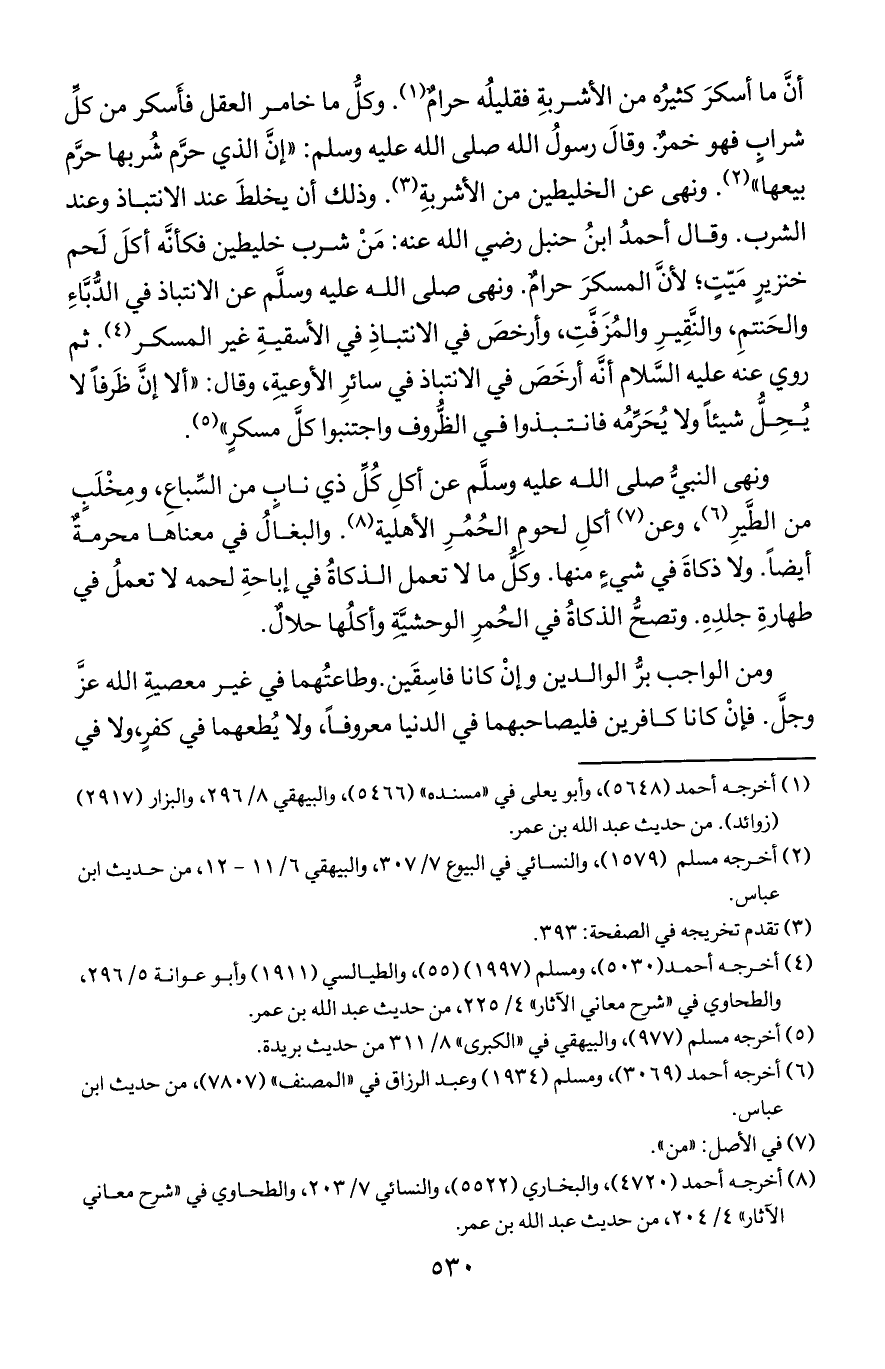 أن ما أسكر كثيره من الأشربة فقليله حرام. وكا ما خامر العقل فأسكر من كل شراب فهو خمر. وقال رسول الله صلى الله عليه وسلم: "إن الذي حرم شربها حرم بيعها". ونهى عن الخليطين من الأشربة. وذلك أن يخلط عند الانتباذ وعند الشرب. وقال أحمد ابن حنبل رضي الله عنه: من شرب خليطين فكأنه أكل لحم خنزير ميت؛ لأن المسكر حرام. ونهى صلى الله عليه وسلم عن الانتباذ في الدباء والحنتم, والنقير والمزفت, وأرخص في الانتباذ في الأسقية غير المسكر. ثم روي عنه عليه السلام أنه أرخص في الانتباذ في سائر الأوعية, وقال: "ألا إن ظرفا لا يحل شيئا ولا يحرمه فانتبذوا في الظروف واجتنبوا كل مسكر".