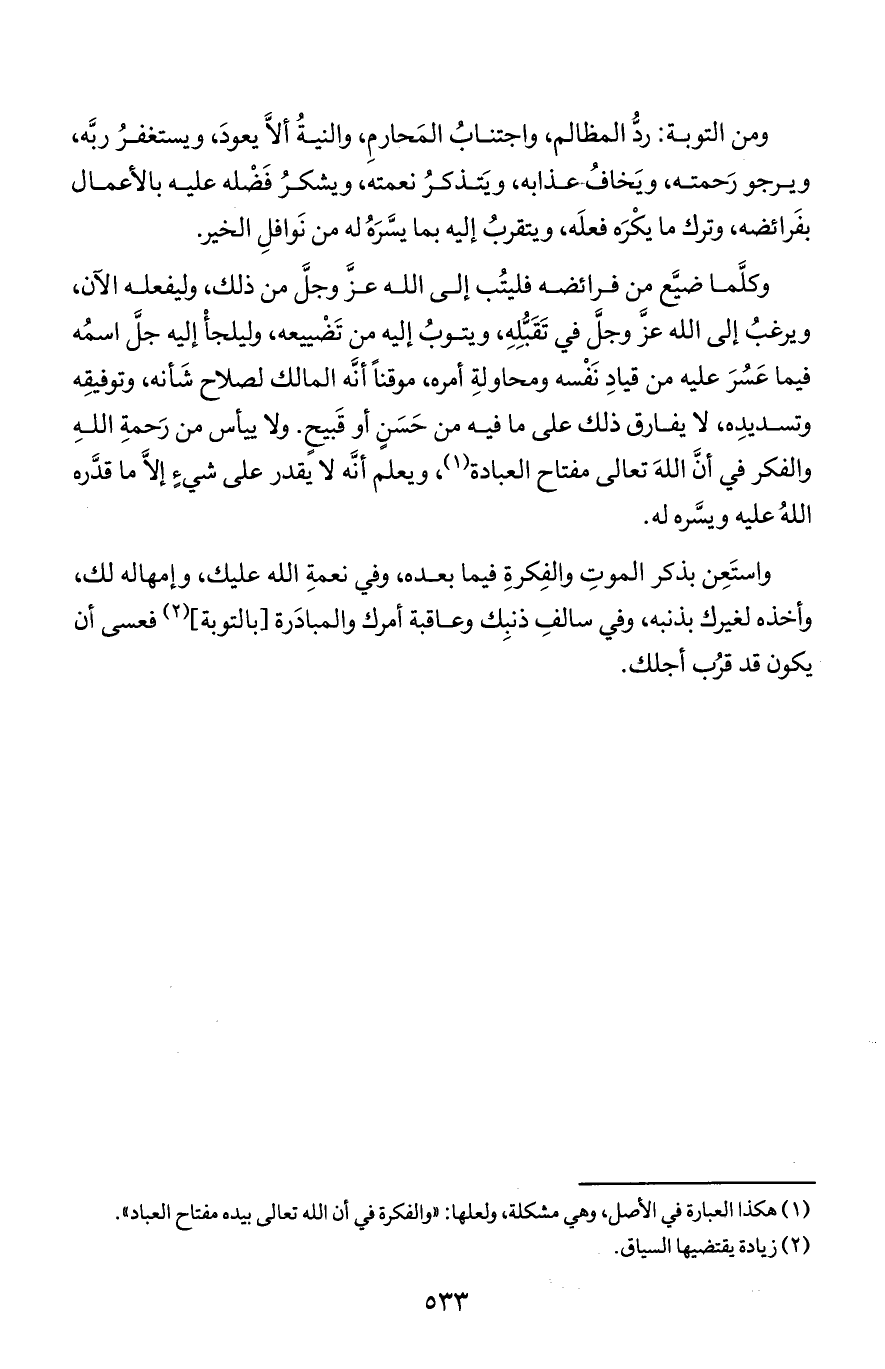 وكلما ضيع من فرائضه فليتب إلى الله عز وجل من ذلك, وليفعله الآن, ويرغب إلى الله عز وجل في تقبله, ويتوب إليه من تضييعه, وليلجأ إليه جل اسمه فيما عسر عليه من قياد نفسه ومحاولة أمره, موقنا أنه المالك لصلاح شأنه, وتوفيقه وتسديده, لا يفارق ذلك على ما فيه من حسن أو قبيح. ولا ييأس من رحمة الله والفكر في أن الله تعالى مفتاح العبادة, ويعلم أنه لا يقدر على شيء إلا ما قدره الله عليه ويسره له.