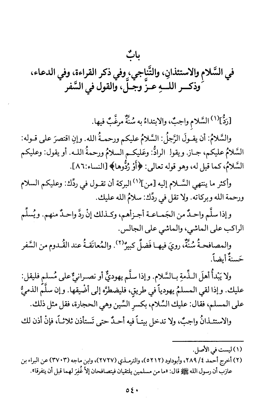 والسلام: أن يقول الرجل: السلام عليكم ورحمة الله. وإن اقتصر على قوله: السلام عليكم, جاز. ويقول الراد: وعليكم السلام ورحمة الله. أو يقول: وعليكم السلام, كما قيل له, وهو قوله تعالى: {أو ردوها} [النساء: 86].
