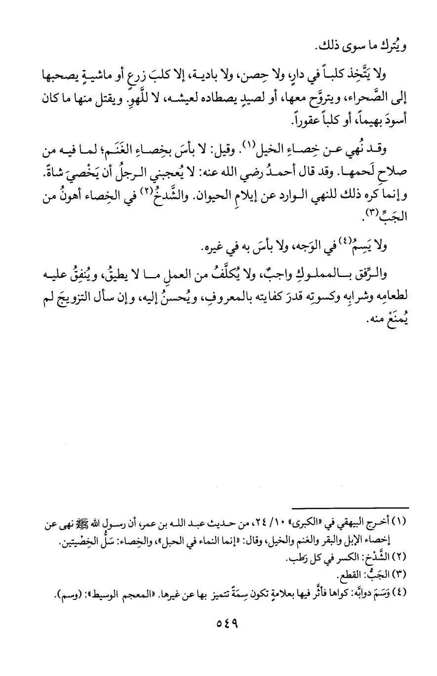 ولا يتخذ كلبا في دار, ولا حصن, ولا بادية, إلا كلب زرع أو ماشية يصحبها إلى الصحراء, ويتروح معها, أو لصيد يصطاده لعيشه, لا للهو. ويقتل منها ما كان أسود بهيما, أو كلبا عقورا.