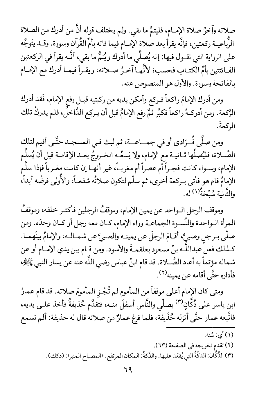 وموقف الرجل الواحد عن يمين الإمام وموقف الرجلين فأكثر خلفه وموقف المرأة الواحدة والنسوة الجماعة وراء الإمام كان معه رجل أو كان وحده. ومن صلى برجل وصبي أقام الرجل عن يمينه والصبي عن شماله والإمام بينهما كذلك فعل عبدالله بن مسعود بعلقمة والأسود ومن قام بين يدي الإمام أو عن شماله مؤتما به أعاد الصلاة قد قام ابن عباس رضي الله عنه عن يسار النبي صلى الله عليه وسلم فأداره حتى أقامه عن يمينه.
