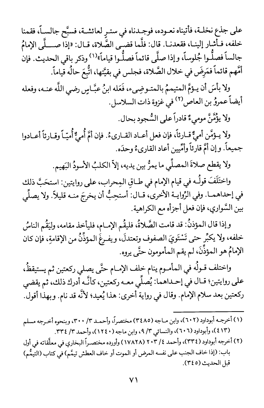 على جذع نخلة فأتيناه نعوده فوجدناه في سترٍ لعائشة فسبح جالسا فقمنا خلفه فأشار إلينا فقعدنا قال: فلما قضى الصلاة قال: (إذا صلى الإمام جالسا فصلوا جلوسا وإذا صلى قائما فصلوا قياما)) وذكر باقي الحديث فإن أمهم قائما فمرض في خلال الصلاة فجلس في بقيتها اتُّبع حالُه قياما.