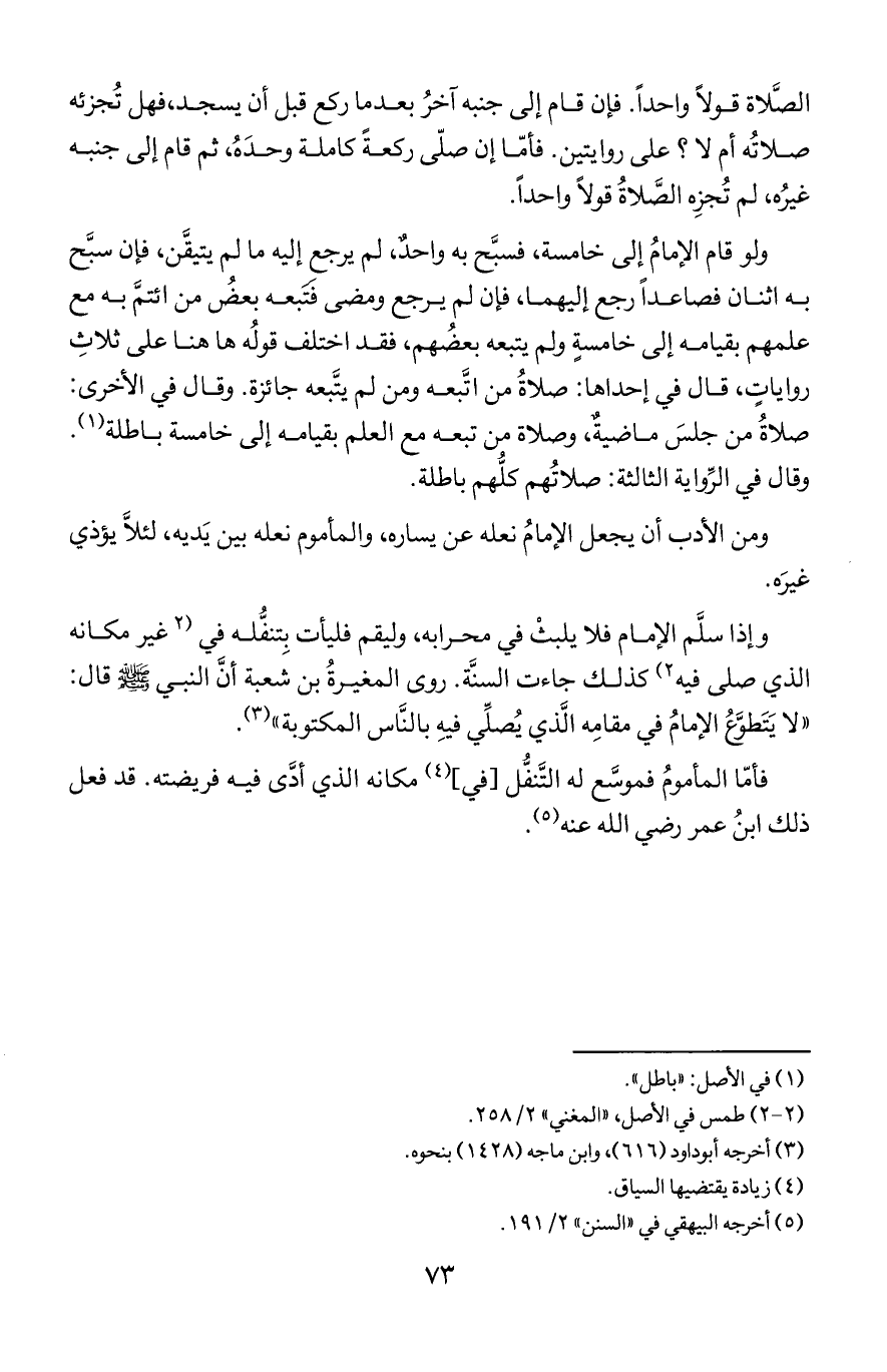 ولو قام الإمام إلى خامسة فسبح به واحد لم يرجع إليه مالم يتيقن فإن سبح به اثنان فصاعدا رجع إليهما فإن لم يرجع ومضى فتتبعه بعض من ائتم به مع علمهم بقيامه إلى خامسة ولم يتبعه بعضهم فقد اختلف قوله هاهنا على ثلاث روايات قال في إحداها: صلاة من اتبعه ومن لم يتبعه جائزة وقال في الأخرى: صلاة من جلس ماضية وصلاة من تبعة مع العلم بقيامه إلى خامسة باطلة وقال في الرواية الثالثة: صلاتهم كلهم باطلة.