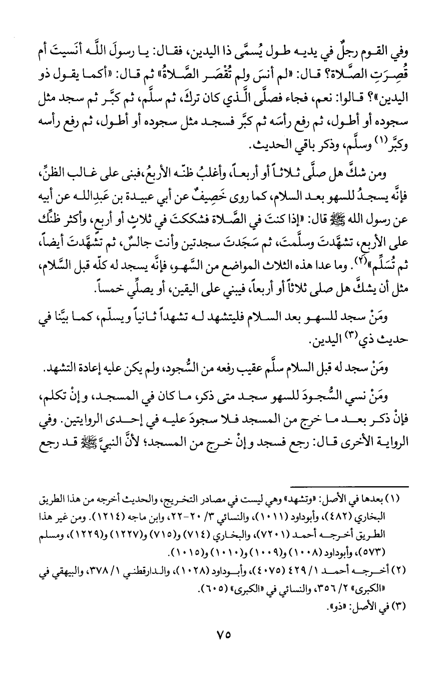 وفي القوم رجل في يديه طول يٌسمى ذا اليدين فقال: يارسول الله أنسيت أم قُصرت الصلاة؟ قال: (لم أنس ولم تقصر الصلاةُ) ثم قال (أكما يقول ذو اليدين)؟ فقالوا: نعم فجاء فصلى الذي كان ترك ثم سلم ثم كبر ثم سجد مثل سجودة أو أطول ثم رفع رأسه ثم كبر فسجد مثل سجودة أو أطول ثم رفع رأسه وكبر وسلم، وذكر باقي الحديث.