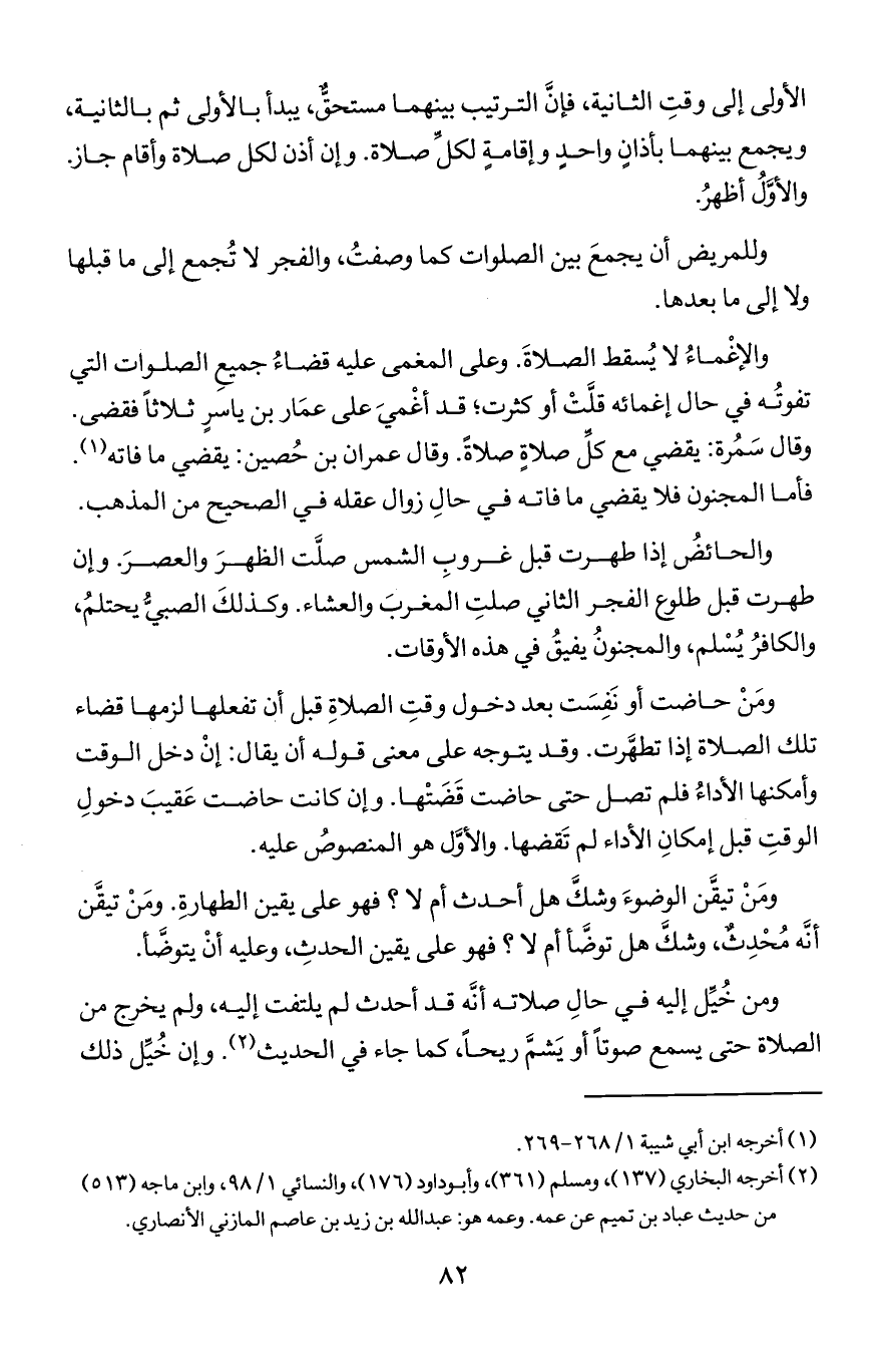 والحائض إذا صلت قبل غروب الشمس صلَّت الظهر والعصر وإن طهرت قبل طلوع الفجر الثاني صلت المغرب والعشاء وكذلك الصبي يحتلم والكافر يُسلم والمجنون يفيق في هذه الأوقات.