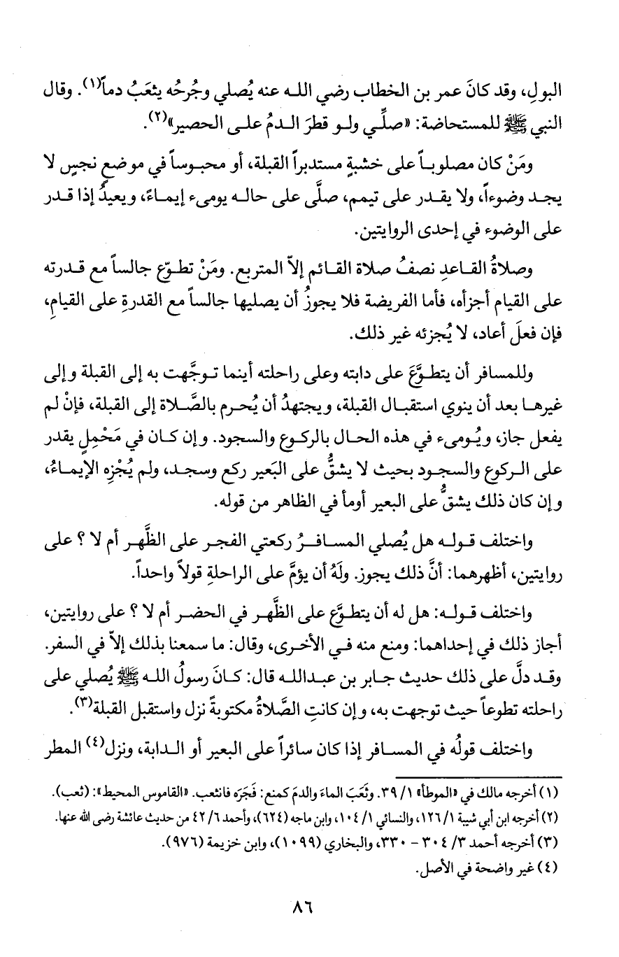 البول وقد كان عمر بن الخطاب رضي الله عنه يُصلي وجرحه يثعب دما وقال النبي صلى الله عليه وسلم للمستحاضة: (صلي ولو قطر الدم على الحصير) ومن كان مصلوبا على خشبة مستدبرا القبلة أو محبوسا في موضع نجس لا يجد وضوءا ولا يقدر على تيمم صلى على حاله يومئ إيماء ويعيد إذا قدر على الوضوء في إحدى الروايتين.