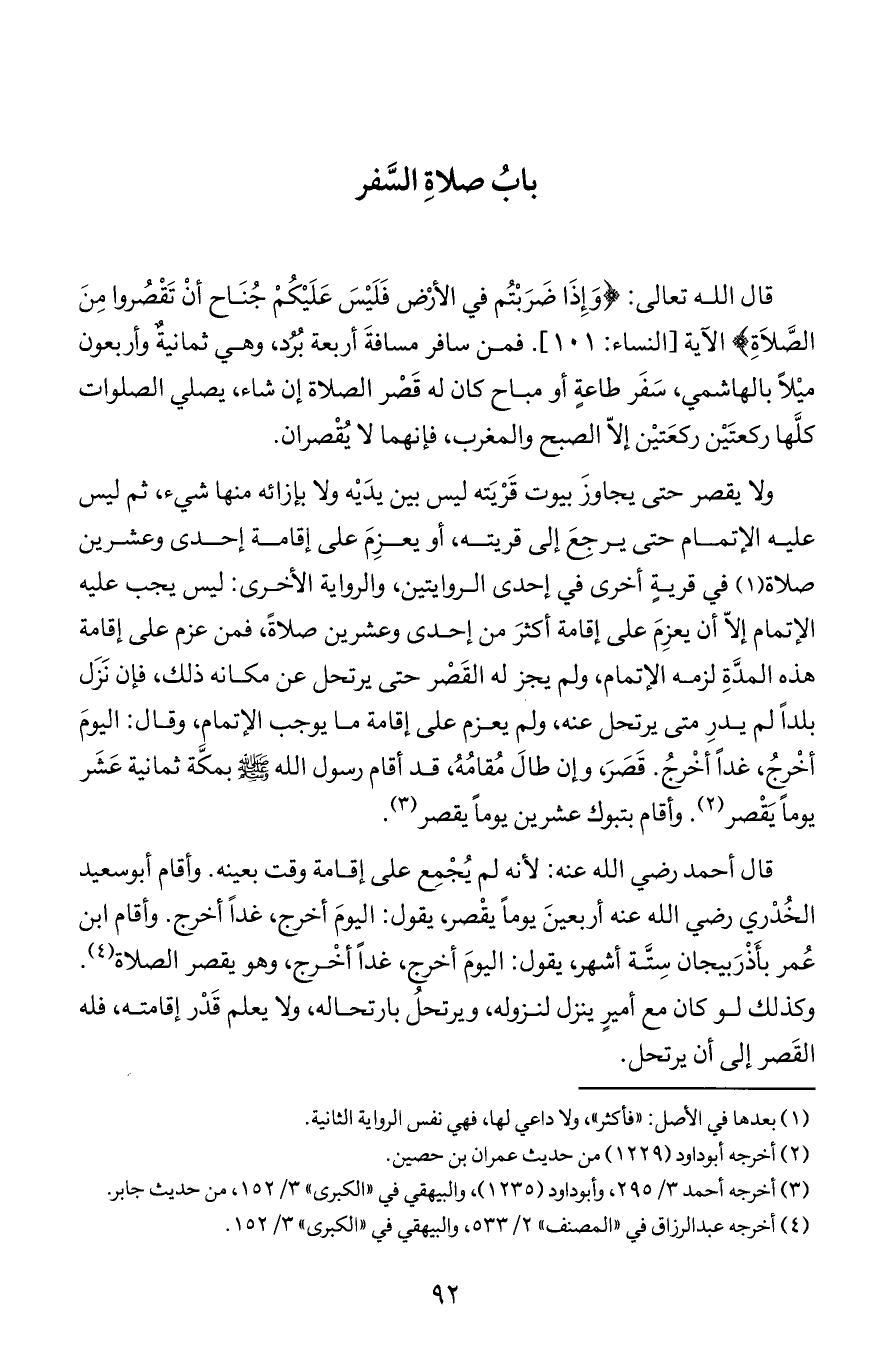 قال الله تعالى (وإذا ضربتم في الأرض فليس عليكم جناح أن تقصروا من الصلاة) الآية (النساء101) فمن سافر مسافة أربعة بُرُد وهي ثمانية وأربعون ميلا بالهاشمي سفر طاعة أو مباح كان له قصر الصلاة إن شاء يصلي الصلوات كلها ركعتين ركعتين إلا الصبح والمغرب فإنهما لايقصران.