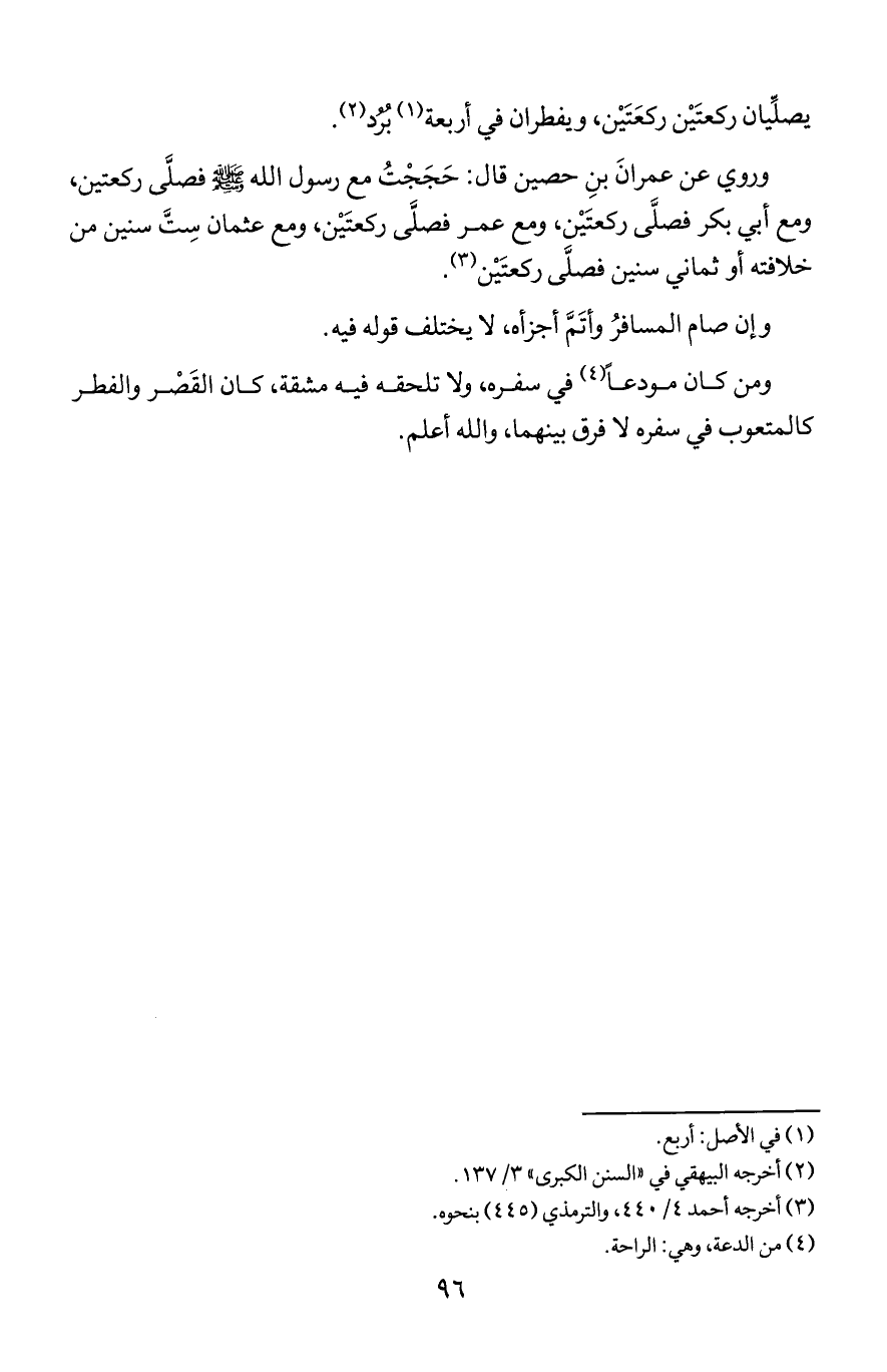 وروي عن عمران بن حصين قال: حججت مع رسول الله صلى الله عليه وسلم فصلى ركعتين ومع أبي بكر فصلى ركعتين ومع عمر فصلى ركعتين ومع عثمان ست سنين من خلافته أو ثماني سنين فصلى ركعتين.