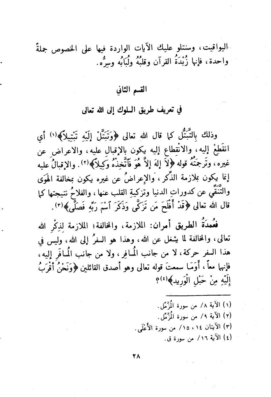 فعُمدَةُ الطريق أمران: الملازمة، والمخالفة؛ الملازمة لِذِكْرِ الله تعالى، والمخالفة لما يشغل عن الله، وهذا هو السفرُ إلى الله، وليس في هذا السفر حركة، لا من جانب المُسافِر، ولا من جانب المُسافَرِ إليه، فإنهما معاً، أَوَمَا سمعتَ قوله تعالى وهو أصدق القائلين {وَنَحْنُ أَقْرَبُ إِلَيْهِ مِنْ حَبْلِ الوريد} ؟