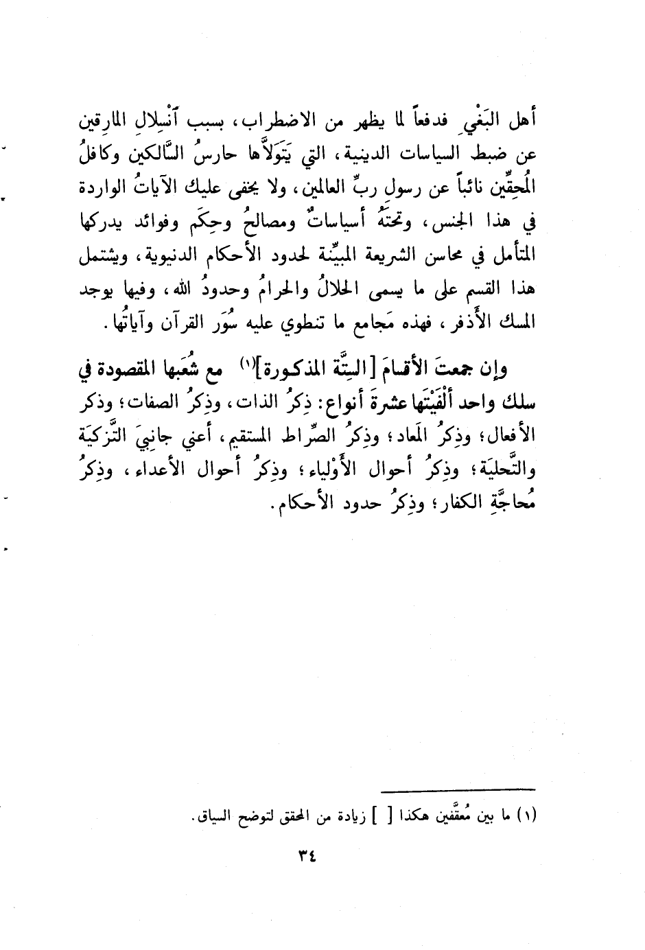 أهل البَغْيِ فدفعاً لما يظهر من الاضطراب، بسبب انْسِلالِ المارِقين عن ضبط السياسات الدينية، التي يَتَوَلاَّها حارسُ السَّالكين وكافلُ المُحِقِّين نائباً عن رسولِ ربِّ العالمين، ولا يخفى عليك الآياتُ الواردة في هذا الجنس، وتحتَهُ أسياساتٌ ومصالحُ وحِكَم وفوائد يدركها المتأمل في محاسن الشريعة المبيِّنة لحدود الأحكام الدنيوية، ويشتمل هذا القسم على ما يسمى الحلالُ والحرامُ وحدودُ الله، وفيها يوجد المسك الأَذفر، فهذه مَجامع ما تنطوي عليه سُوَر القرآن وآياتُها.