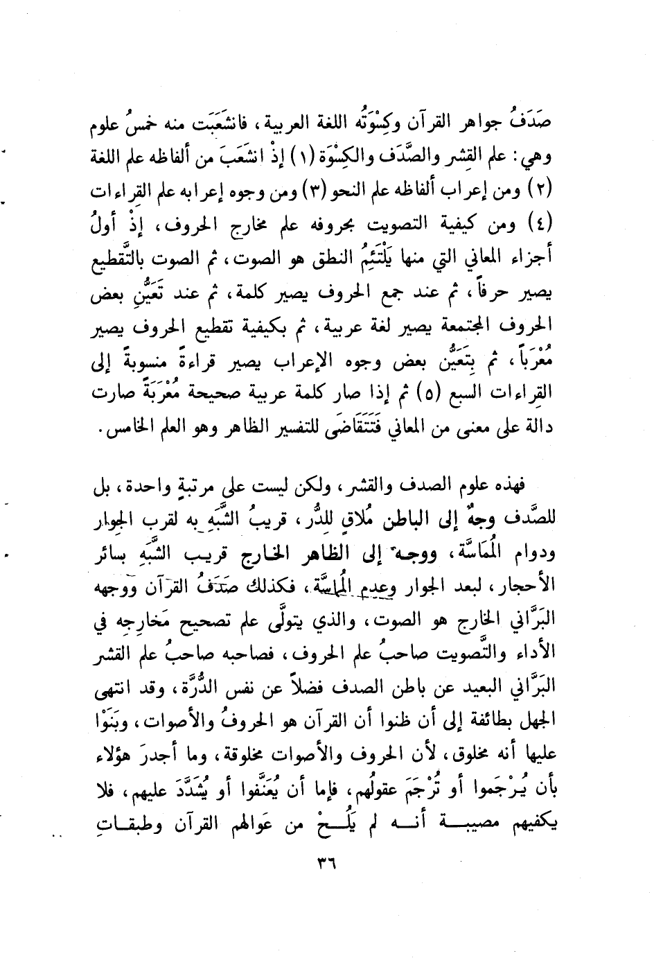 فهذه علوم الصدف والقشر، ولكن ليست على مرتبةٍ واحدة، بل للصَّدف وجهٌ إلى الباطن مُلاقٍ لِلدُّر، قريبُ الشَّبَهِ به لقرب الجِوار ودوام المُمَاسَّة، ووجه إلى الظاهر الخارج قريب الشَّبَهِ بسائر الأحجار، لبعد الجوار وعدم المُماسَّة، فكذلك صَدَفُ القرآن ووجهه البَرَّاني الخارج هو الصوت، والذي يتولَّى علم تصحيح مَخارِجِه في الأداء والتَّصويت صاحبُ علم الحروف، فصاحبه صاحبُ علم القشر البَرَّاني البعيد عن باطن الصدف فضلاً عن نفس الدُّرَّة، وقد انتهى الجهل بطائفة إلى أن ظنوا أن القرآن هو الحروفُ والأصوات، وبَنَوْا عليها أنه مخلوق، لأن الحروف والأصوات مخلوقة، وما أجدرَ هؤلاء بأن يُرْجَموا أو تُرْجَمَ عقولُهم، فإما أن يُعَنَّفوا أو يُشَدَّدَ عليهم، فلا يكفيهم مصيبة أنه لم يَلُحْ من عَوالهم القرآن وطبقاتِ