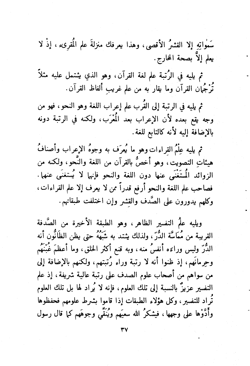 ويليه علمُ التفسير الظاهر، وهو الطبقة الأخيرة من الصَّدفة القريبة من مُمَاسَّة الدُّرّ، ولذلك يشتد به شَبَهُهُ حتى يظن الظَانُّون أنه الدُّرّ وليس وراءَه أنفسُ منه، وبه قنع أكثر الخلق، وما أعظمَ غُبْنَهُم وحِرمانَهم، إذ ظنوا أنه لا رتبة وراء رُتبتهم، ولكنهم بالإضافة إلى من سواهم من أصحاب علوم الصدف على رتبة عالية شريفة، إذ علم التفسير عزيزٌ بالنسبة إلى تلك العلوم، فإنه لا يُراد لها بل تلك العلوم تُراد للتفسير، وكلا هؤلاء الطبقات إذا قاموا بشرط علومهم فحفظوها وأَدَّوْها على وجهها، فيشكرُ الله سعيَهم ويُنَقِّي وجوهَهم كما قال رسول