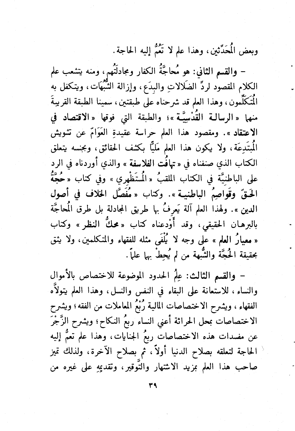 - والقسم الثاني: هو مُحاجَّةُ الكفار ومجادَلتُهم، ومنه يتشعب علم الكلام المقصود لردِّ الضَلالاتِ والبِدَع، وإزالة الشُّبُهات، ويتكفل به المُتَكَلِّمون، وهذا العلم قد شرحناه على طبقتين، سمينا الطبقة القريبةَ منهما " الرسالة القُدْسِيَّة"؛ والطبقة التي فوقها "الاقتصاد في الاعتقاد". ومقصود هذا العلم حراسة عقيدةِ العَوَامّ عن تشويش المُبتَدِعَة، ولا يكون هذا العلم مَليًّا بكشف الحقائق، وبجنسه يتعلق الكتاب الذي صنفناه في "تهافُت الفلاسفة" والذي أوردناه في الرد على الباطنِيَّة في الكتاب الملقبُ "المُستَظْهِري" وفي كتاب "حُجَّةُ الحَقّ وقَواصِمُ الباطنية". وكتاب "مُفَصَّل الخلاف في أصول الدين". ولهذا العلم آلة يَعرِفُ بها طريق المجادلة بل طرق المُحاجَّة بالبرهان الحقيقي، وقد أَوْدعناه كتاب "محكُّ النظر" وكتاب "معيارُ العلم" على وجه لا يُلْفى مثله للفقهاء والمتكلمين، ولا يثق بحقيقة الحُجَّة والشُّبهة من لم يُحِطْ بهما علماً.