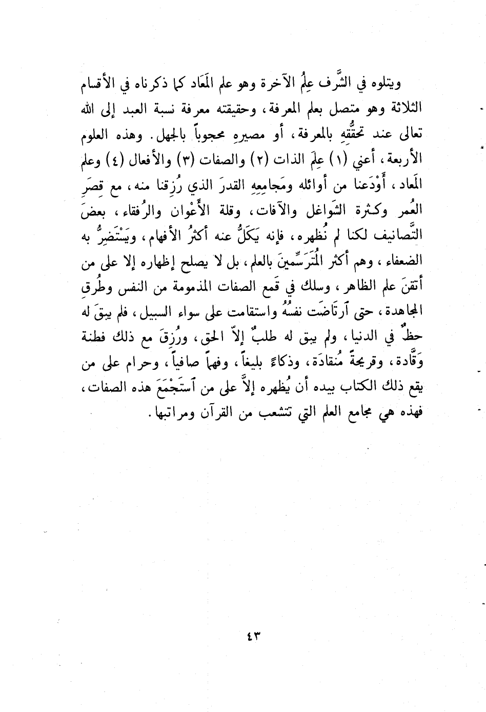 ويتلوه في الشَّرف عِلمُ الآخرة وهو علم المَعَاد كما ذكرناه في الأقسام الثلاثة وهو متصل بعلم المعرفة، وحقيقته معرفة نسبة العبد إلى الله تعالى عند تحقُّقِهِ بالمعرفة، أو مصيرهِ محجوباً بالجهل. وهذه العلوم الأربعة، أعني (1) عِلمَ الذات (2) والصفات (3) والأفعال (4) وعلم المَعاد، أَوْدَعنا من أوائله ومَجامِعِهِ القدرَ الذي رُزِقنا منه، مع قِصَرِ العُمر وكثرة الشَواغل والآفات، وقلة الأَعْوان والرُفقاء، بعضَ التَّصانيف لكنا لم نُظِهره، فإنه يَكَلُّ عنه أكثرُ الأفهام، ويَسْتَضِرُّ به الضعفاء، وهم أكثر المُتَرَسِّمينَ بالعلم، بل لا يصلح إظهاره إلا على من أتقنَ علم الظاهر، وسلك في قَمع الصفات المذمومة من النفس وطُرقِ المجاهدة، حتى ارتَاضَت نفسُهُ واستقامت على سواء السبيل، فلم يبقَ له حظٌ في الدنيا، ولم يبق له طلبٌ إلاّ الحق، ورُزِقَ مع ذلك فطنة وَقَّادة، وقريحةً مُنقادَة، وذكاءً بليغاً، وفهماً صافياً، وحرام على من يقع ذلك الكتاب بيده أن يُظهره إلاَّ على من استَجْمَعَ هذه الصفات، فهذه هي مجامع العلم التي تتشعب من القرآن ومراتبها.