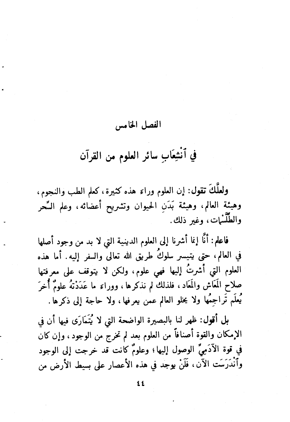 ولعلَّكَ تقول: إن العلوم وراءَ هذه كثيرة، كعلم الطب والنجوم، وهيئة العالم، وهيئة بَدَنِ الحيوان وتشريح أعضائه، وعلم السِّحر والطِّلَّسْمات، وغير ذلك.