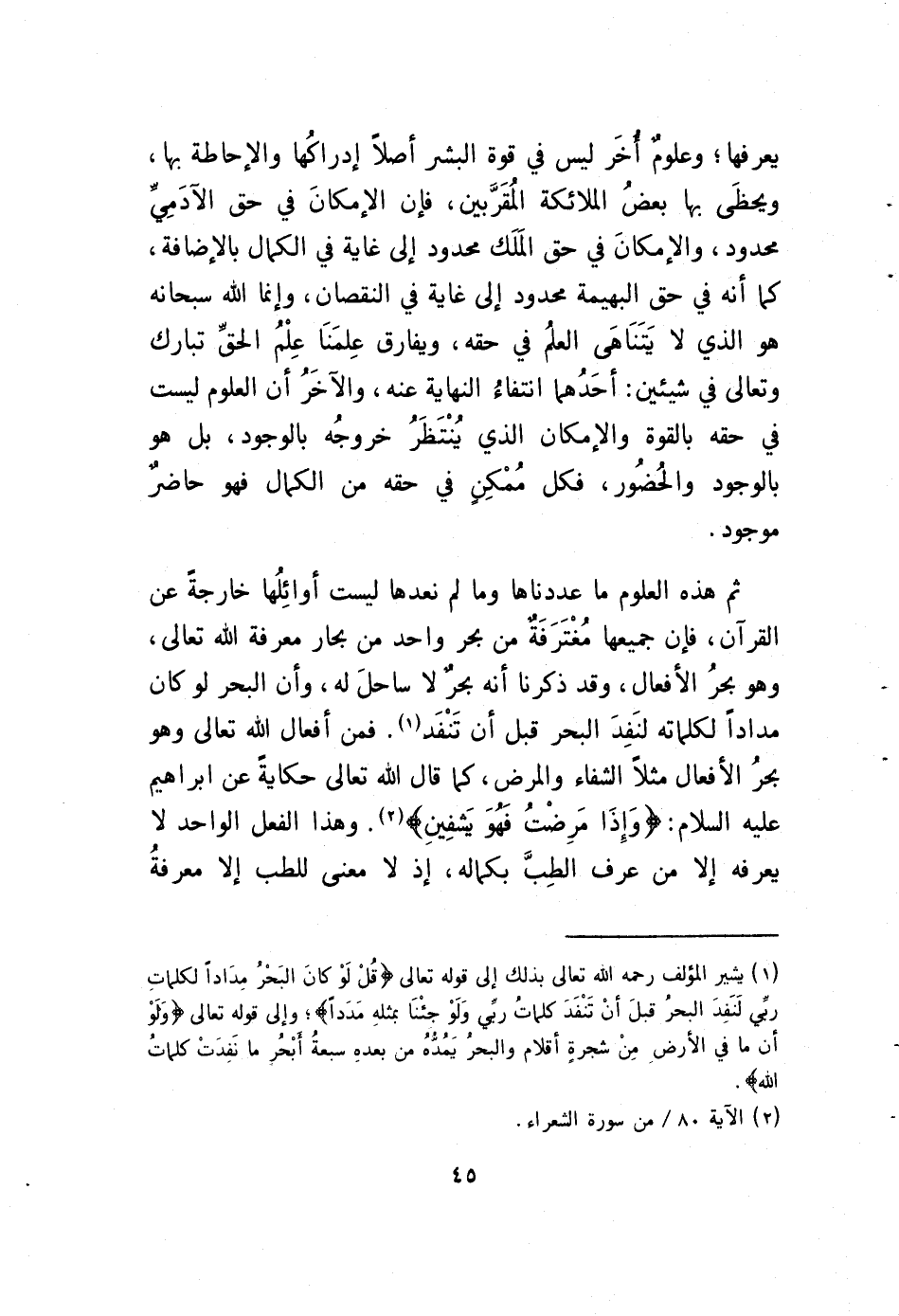 ثم هذه العلوم ما عددناها وما لم نعدها ليست أوائِلُها خارجةً عن القرآن، فإن جميعها مُغْتَرَفَةٌ من بحر واحد من بحار معرفة الله تعالى، وهو بحرُ الأفعال، وقد ذكرنا أنه بحرٌ لا ساحلَ له، وأن البحر لو كان مداداً لكلماته لنَفِدَ البحر قبل أن تَنْفَد. فمن أفعال الله تعالى وهو بحرُ الأفعال مثلاً الشفاء والمرض، كما قال الله تعالى حكايةً عن إبراهيم عليه السلام: {وَإِذَا مَرِضْتُ فَهُوَ يَشْفِينِ} . وهذا الفعل الواحد لا يعرفه إلا من عرف الطِبَّ بكماله، إذ لا معنى للطب إلا معرفةُ