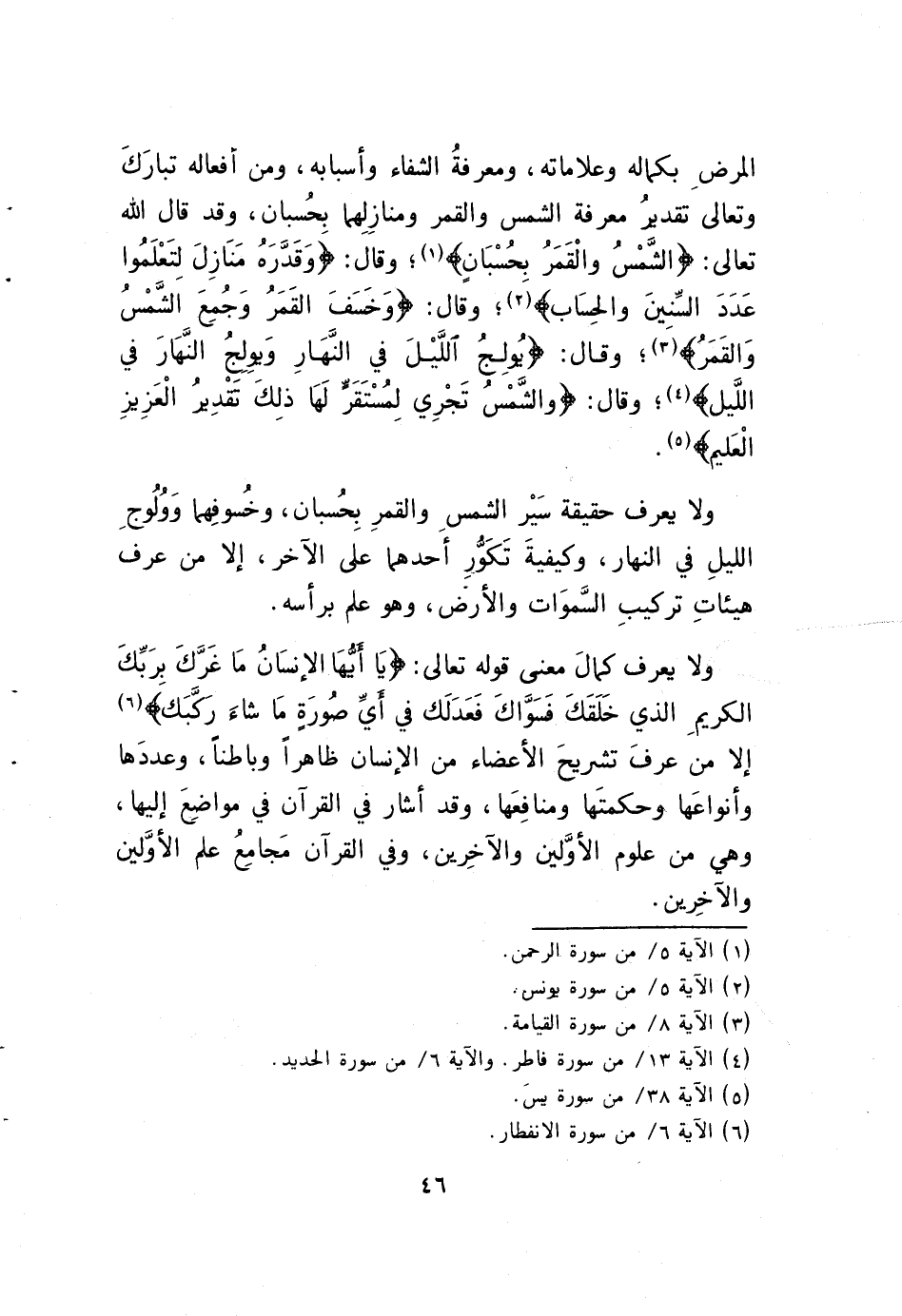 المرض بكماله وعلاماته، ومعرفةُ الشفاء وأسبابه، ومن أفعاله تبارَكَ وتعالى تقديرُ معرفة الشمس والقمر ومنازِلِهما بِحُسبان، وقد قال الله تعالى: {الشمس والقمر بِحُسْبَانٍ} ؛ وقال: {وَقَدَّرَهُ مَنَازِلَ لِتَعْلَمُواْ عَدَدَ السنين والحساب} ؛ وقال: {وَخَسَفَ القمر * وَجُمِعَ الشمس والقمر} ؛ وقال: {يُولِجُ الليل فِي النهار وَيُولِجُ النهار فِي الليل} ؛ وقال: {والشمس تَجْرِي لِمُسْتَقَرٍّ لَّهَا ذَلِكَ تَقْدِيرُ العزيز العليم} .