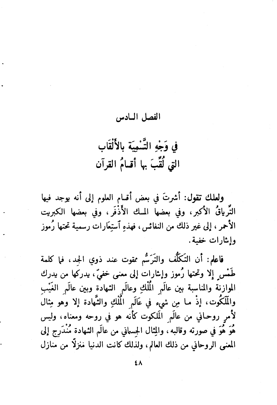 فاعلم: أن التَكَلُّف والتَرَسُّم ممقوت عند ذوي الجِد، فما كلمة طَمْسٍ إِلا وتحتها رُموز وإشارات إلى معنى خفيّ، يدركها من يدرك الموازنة والمناسبة بين عالَمِ المُلْكِ وعالَمِ الشهادة وبين عالَمِ الغَيْبِ والمَلَكُوت، إذْ ما مِن شيء في عَالَمِ المُلْكِ والشَّهادة إلا وهو مِثال لأمرٍ روحاني من عالَمِ المَلكوت كأنه هو في روحه ومعناه، وليس هُوَ هُوَ في صورته وقالبه، والمِثال الجِسماني من عالَم الشهادة مُنْدَرِج إلى المعنى الروحاني من ذلك العالم، ولذلك كانت الدنيا منزلاً من منازل